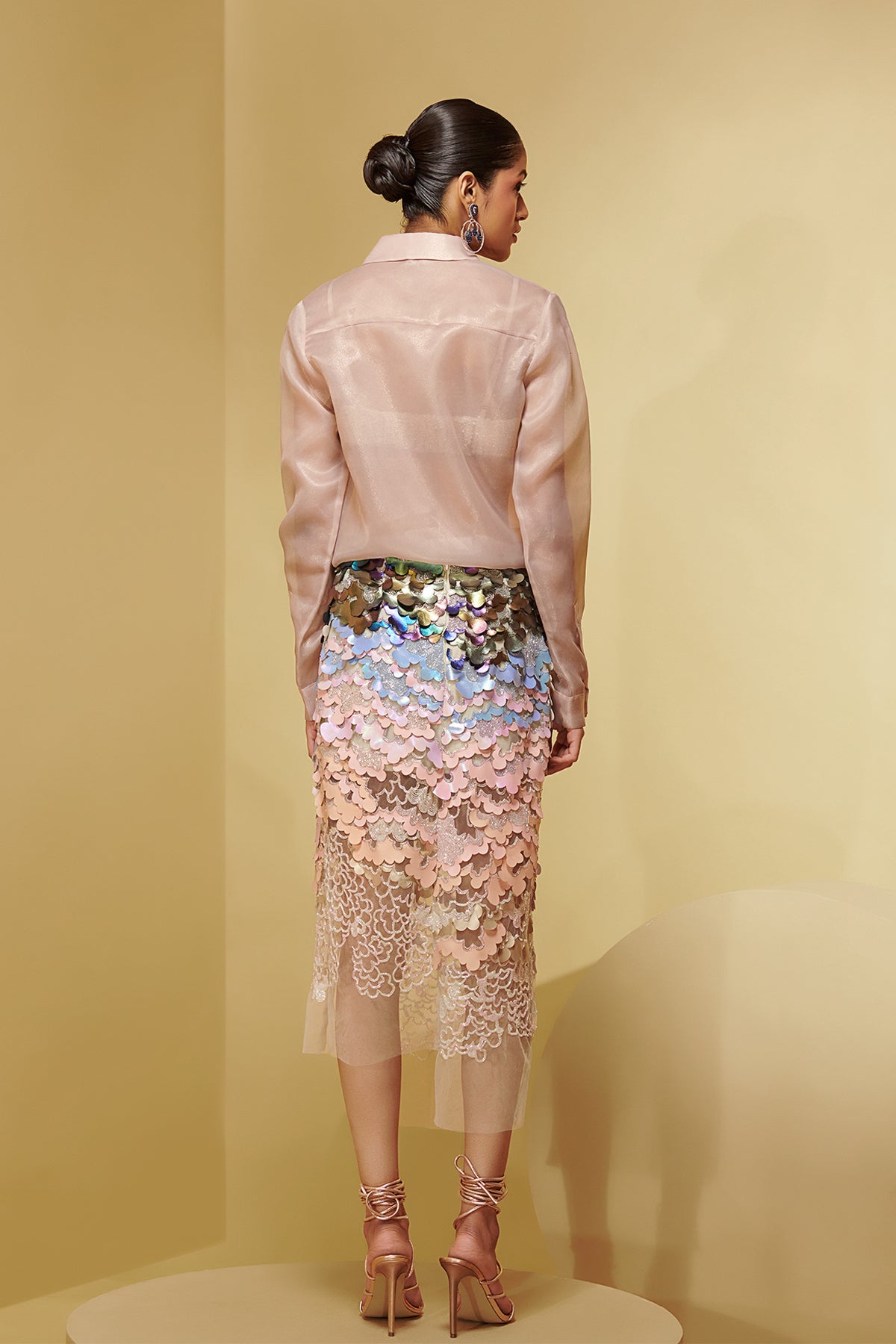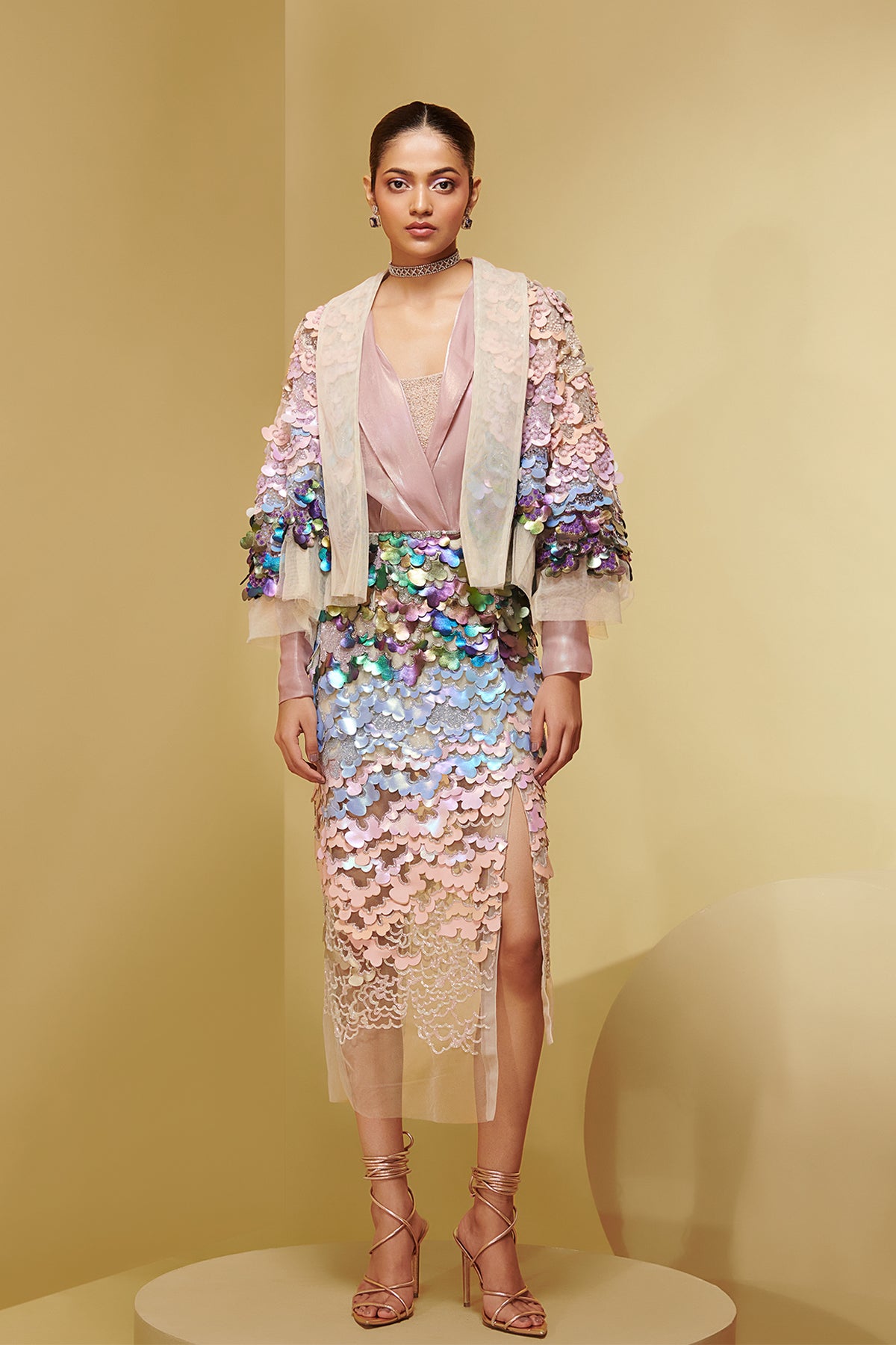 Blush shimmer organza three-piece. Featuring rose quartz foil organza shirt flows like a whisper of stardust, voluminous silhouette, sheer elegance. Complemented with a georgette bralette hand-embroidered with dazzling beads.