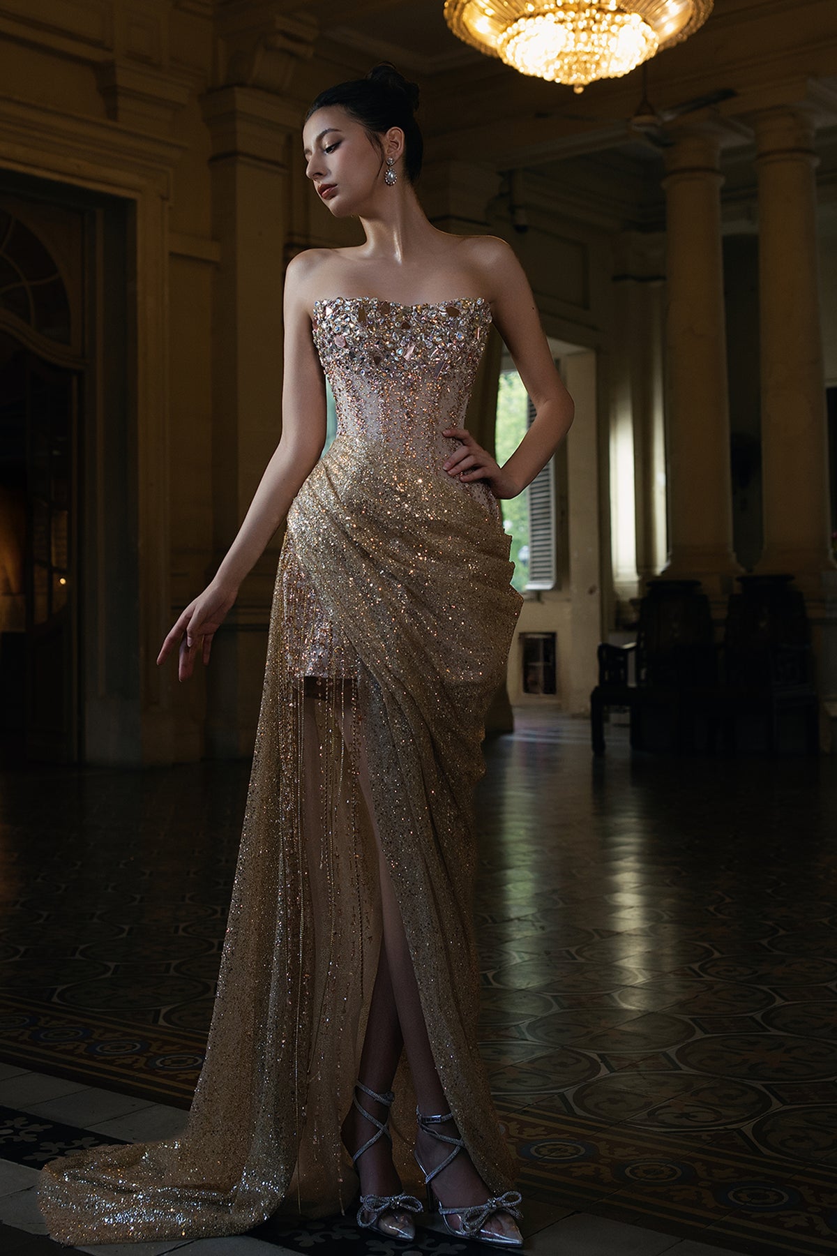 Gold full-length with a sweeping train that trails behind dress. Featuring a densely embellished with crystals, beads and sequins that form a glittering lattice. Complemented with a strapless neckline curving gracefully over the bust and collarbones.