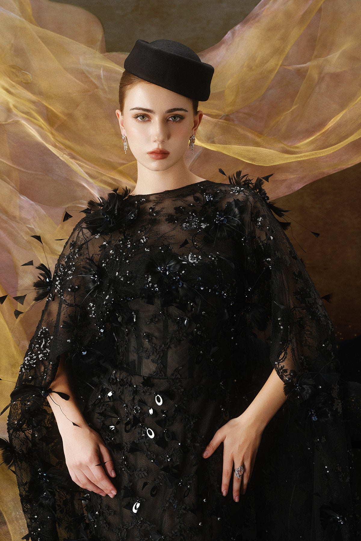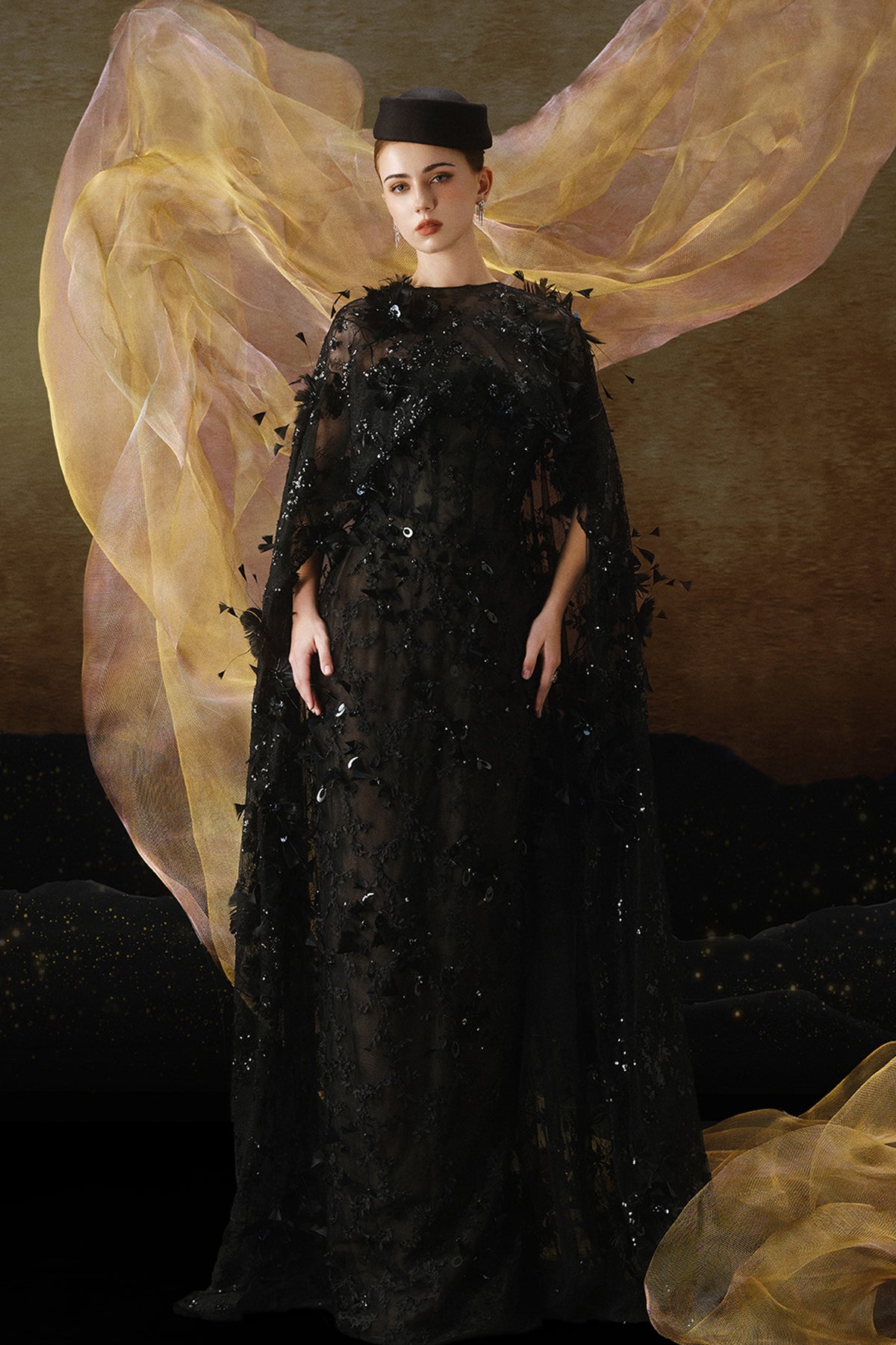 Black sequins long dress. Featuring a boat-like neckline with long sheer sleeves that are densely adorned with embellishments along their length. Complemented with fitted through the bust and waist with seams to sculpt the torso.
