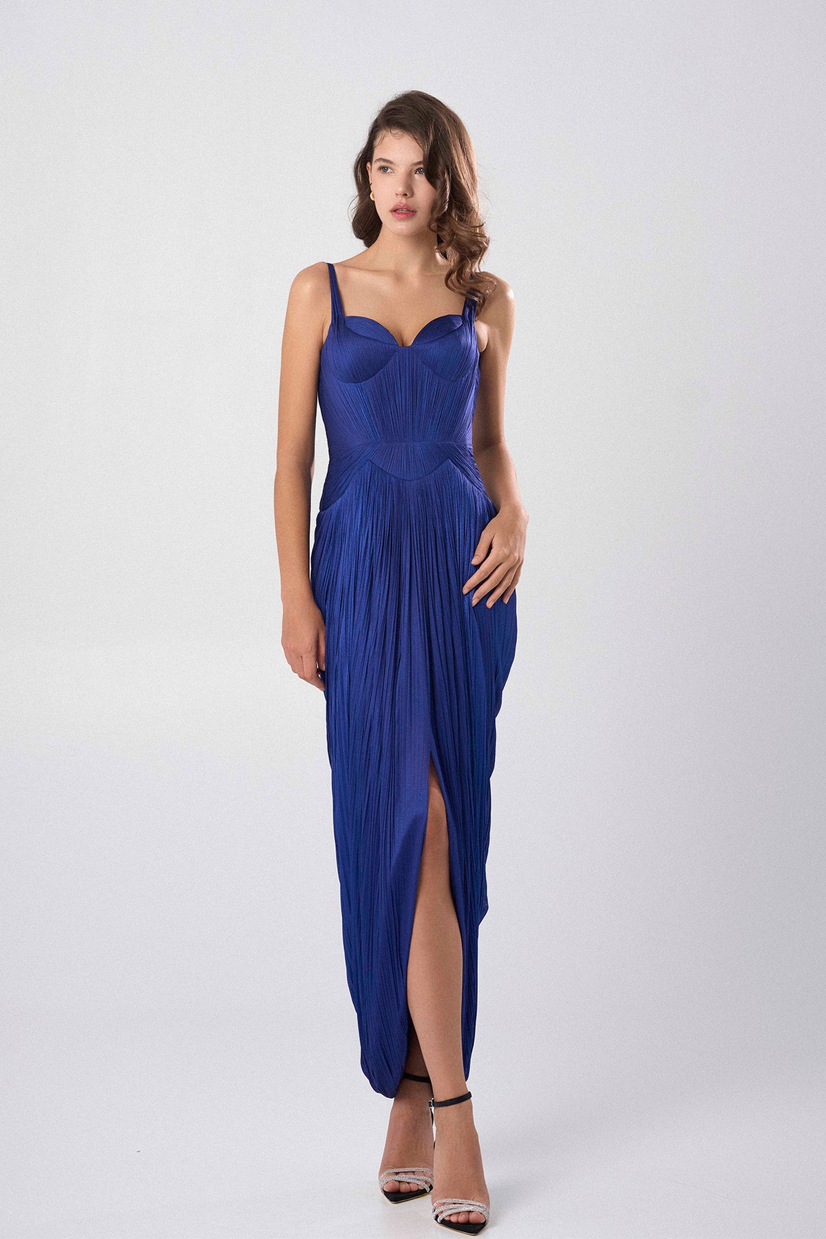 Royal blue full-length dress. Featuring intricate lace or embroidery details, a fitted bodice that beautifully contours the waist and accentuates the curves, with a sweetheart neckline. Complemented with thin, delicate spaghetti straps, a high slit on one side.