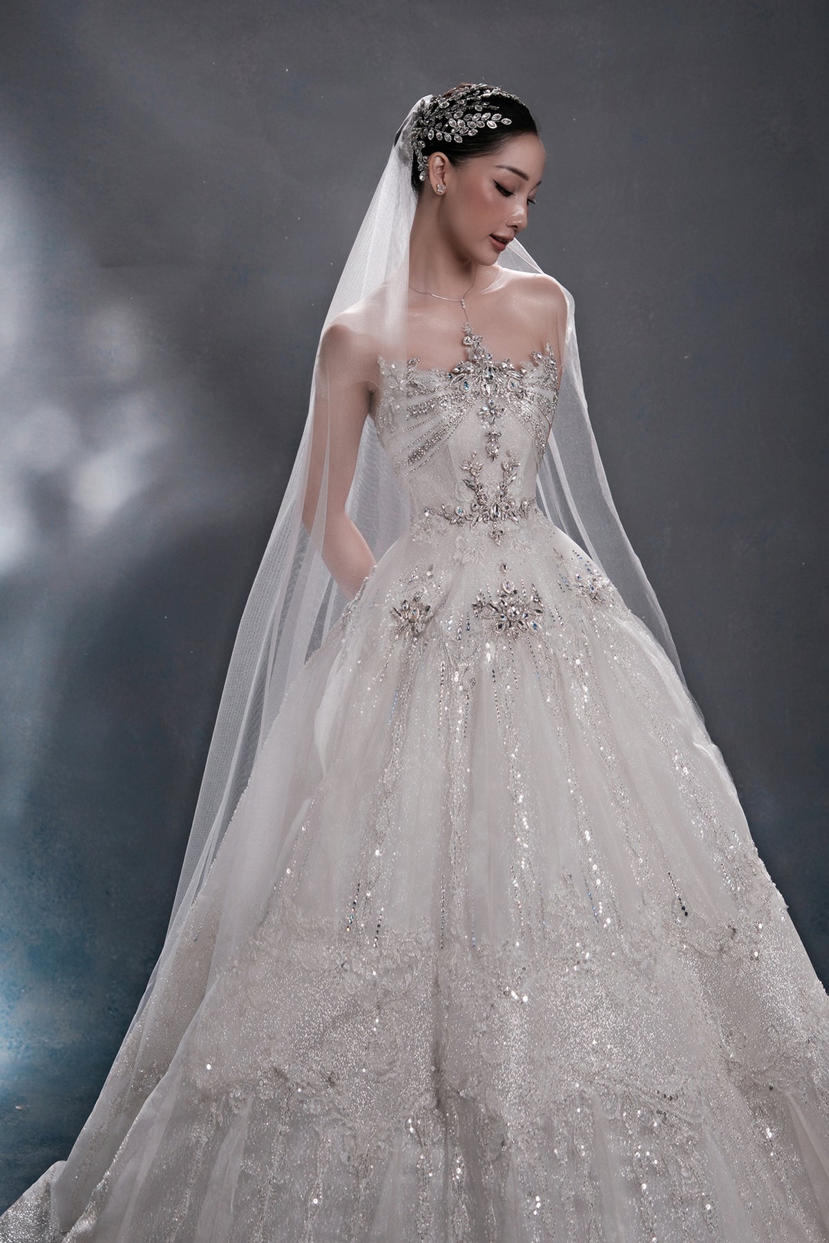 White a-line strapless long dress. Featuring a dense crystal and beadwork across the bodice and upper skirt with a long sheer veil overlays the dress. Complemented with a fitted corseted or boned bodice that cinches at the waist.