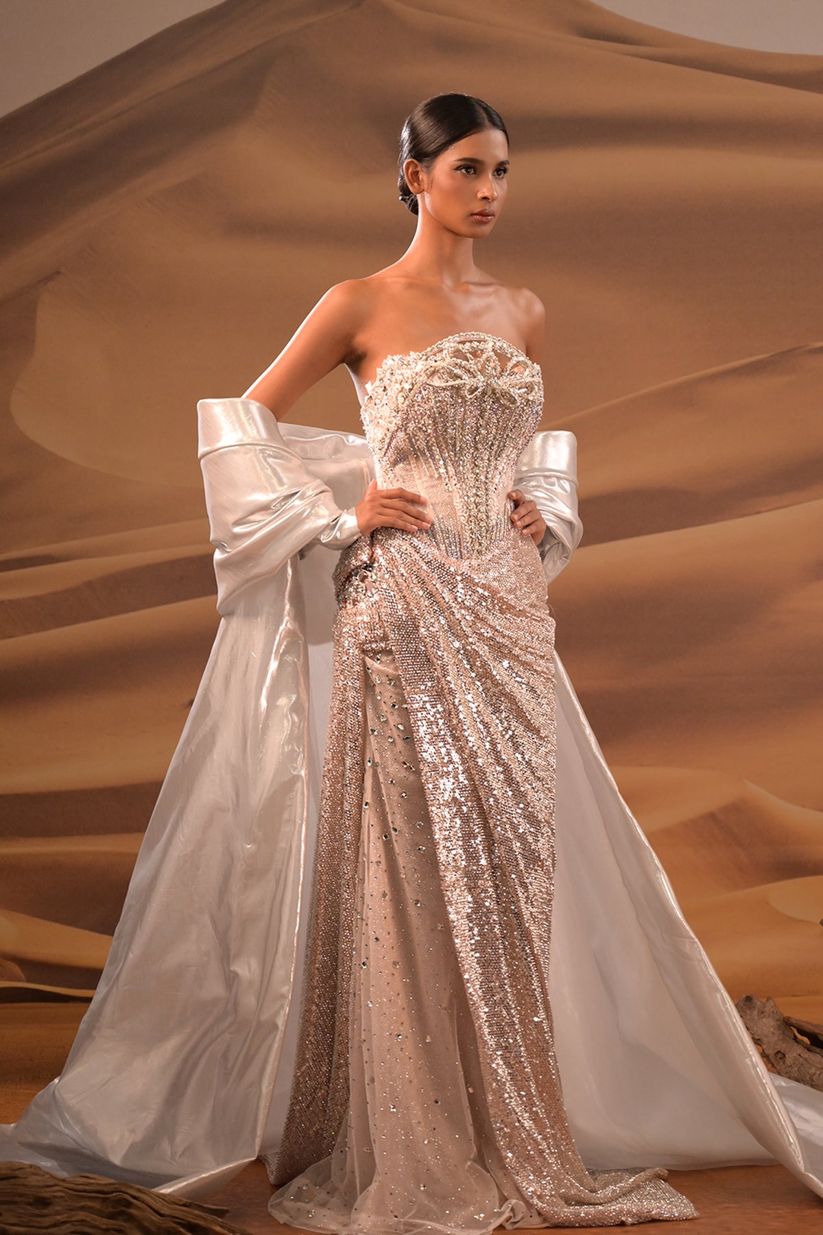 Champagne floor-length column dress. Featuring a fitted corseted bodice that hugs the torso with a strapless neckline that highlights the collarbone and shoulders. Complemented with a dense sequin and bead embroidery densely concentrated across the bust and upper bodice.