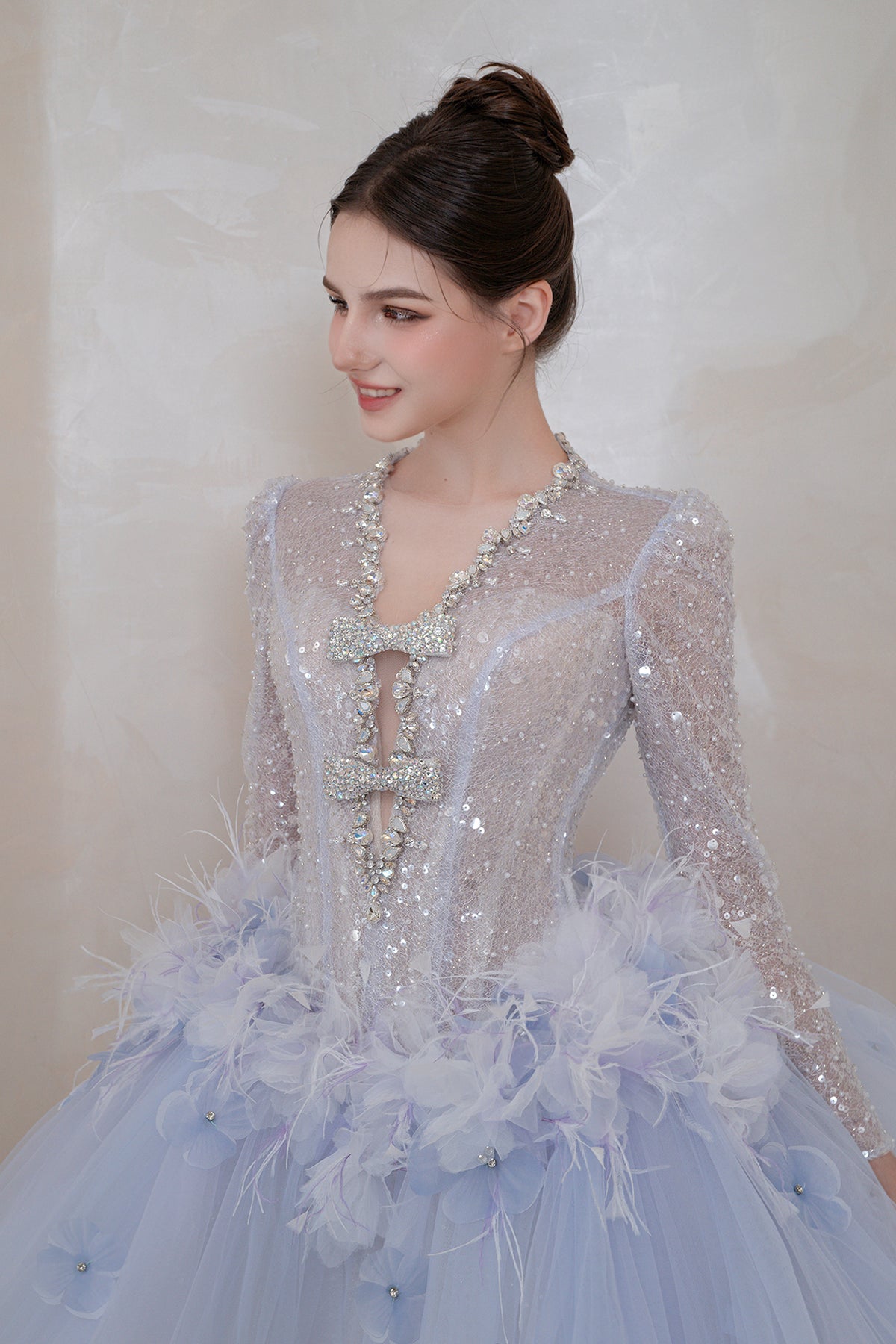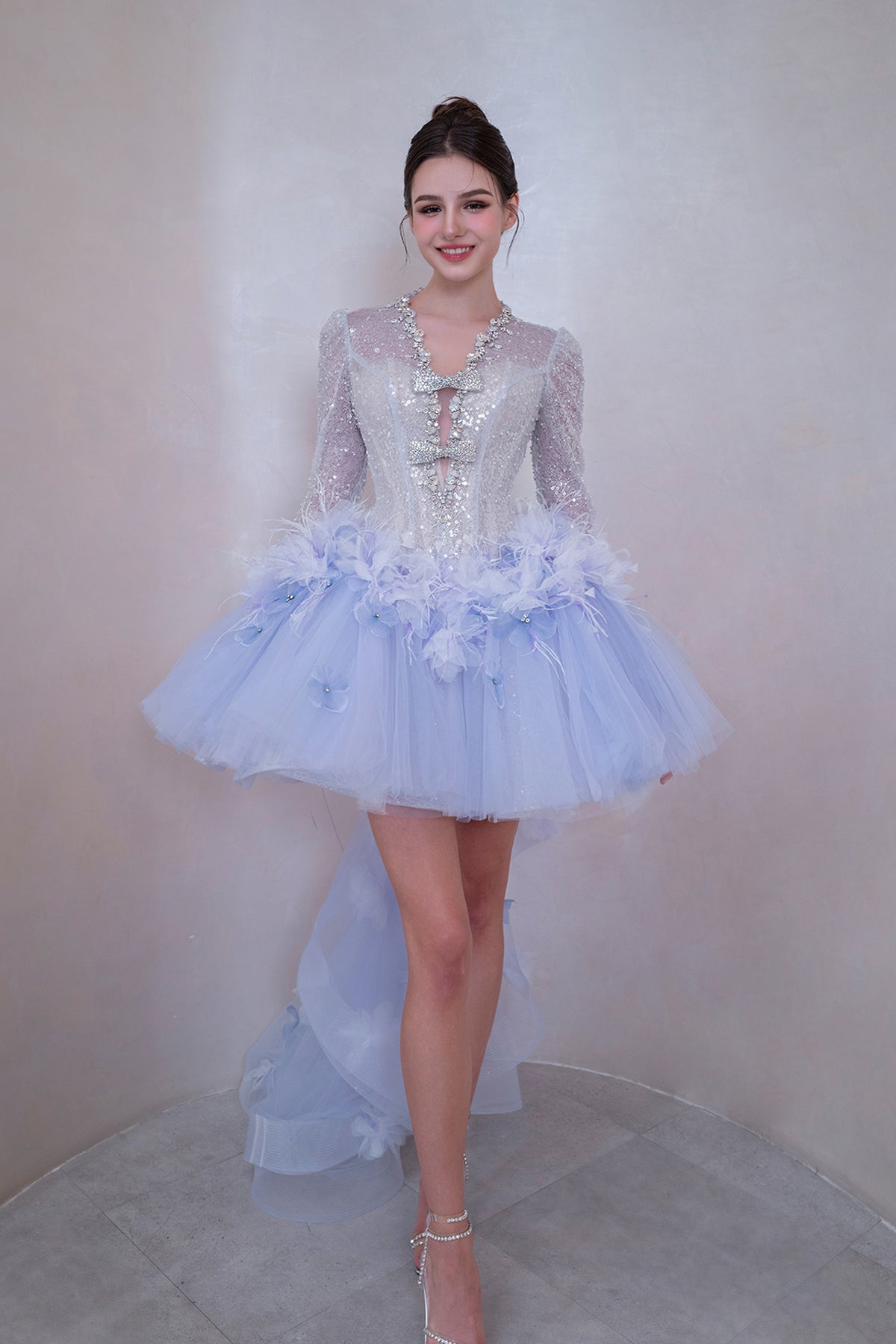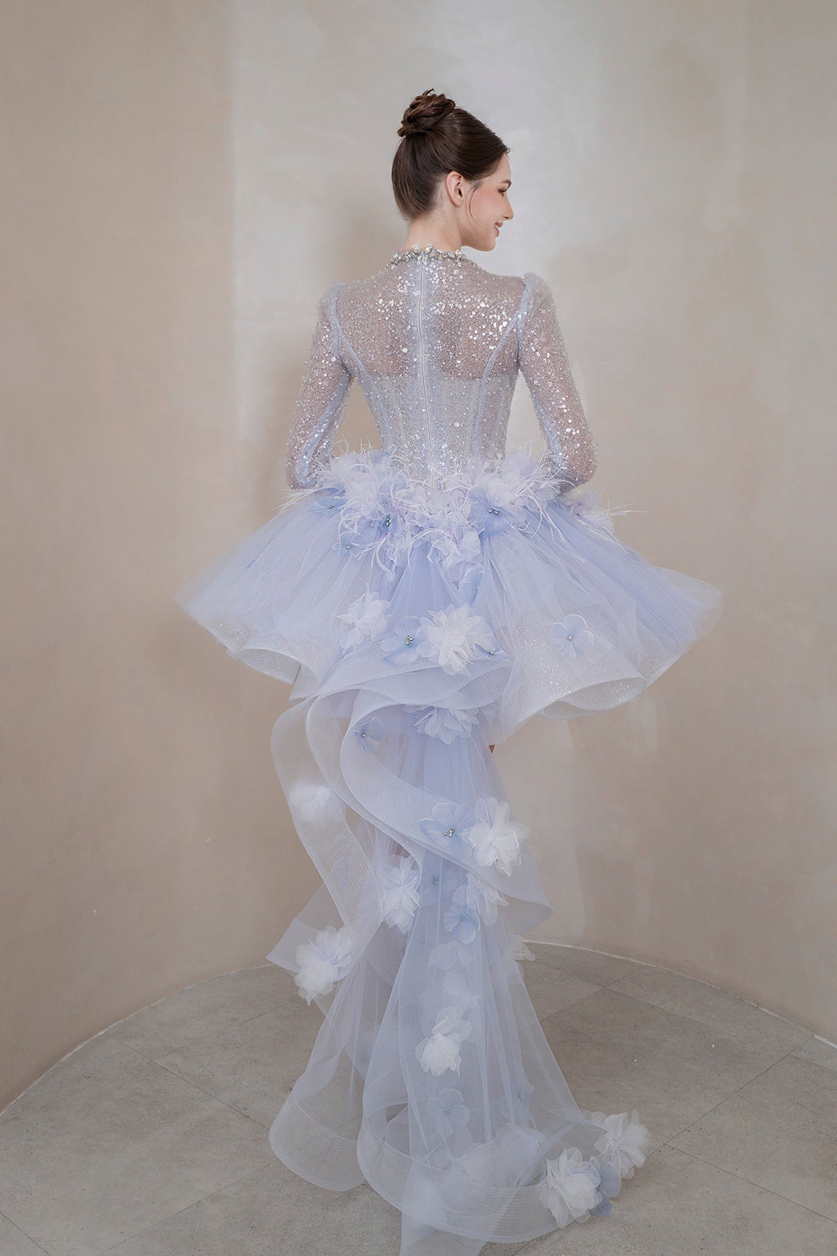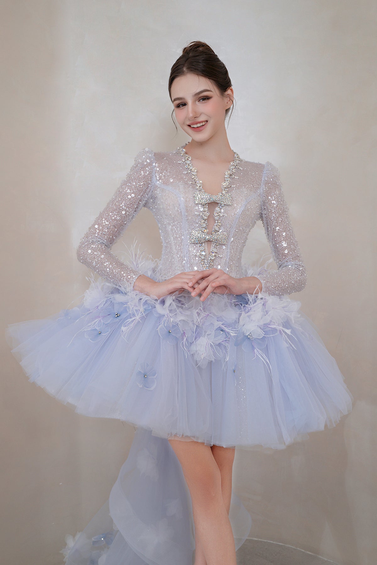 Lavender short-length with long sleeve dress. Featuring a densely embellished with crystals, beads, and sequins arranged in sculptural motifs. Complemented with a cape overlay that trails behind.