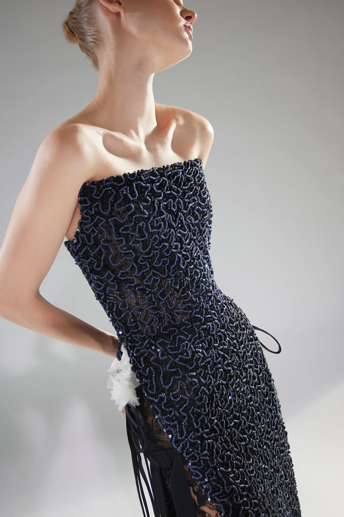 Navy satin long dress. Featuring a column silhouette with a strapless bodice that hugs the torso and waist before flowing into a slender.