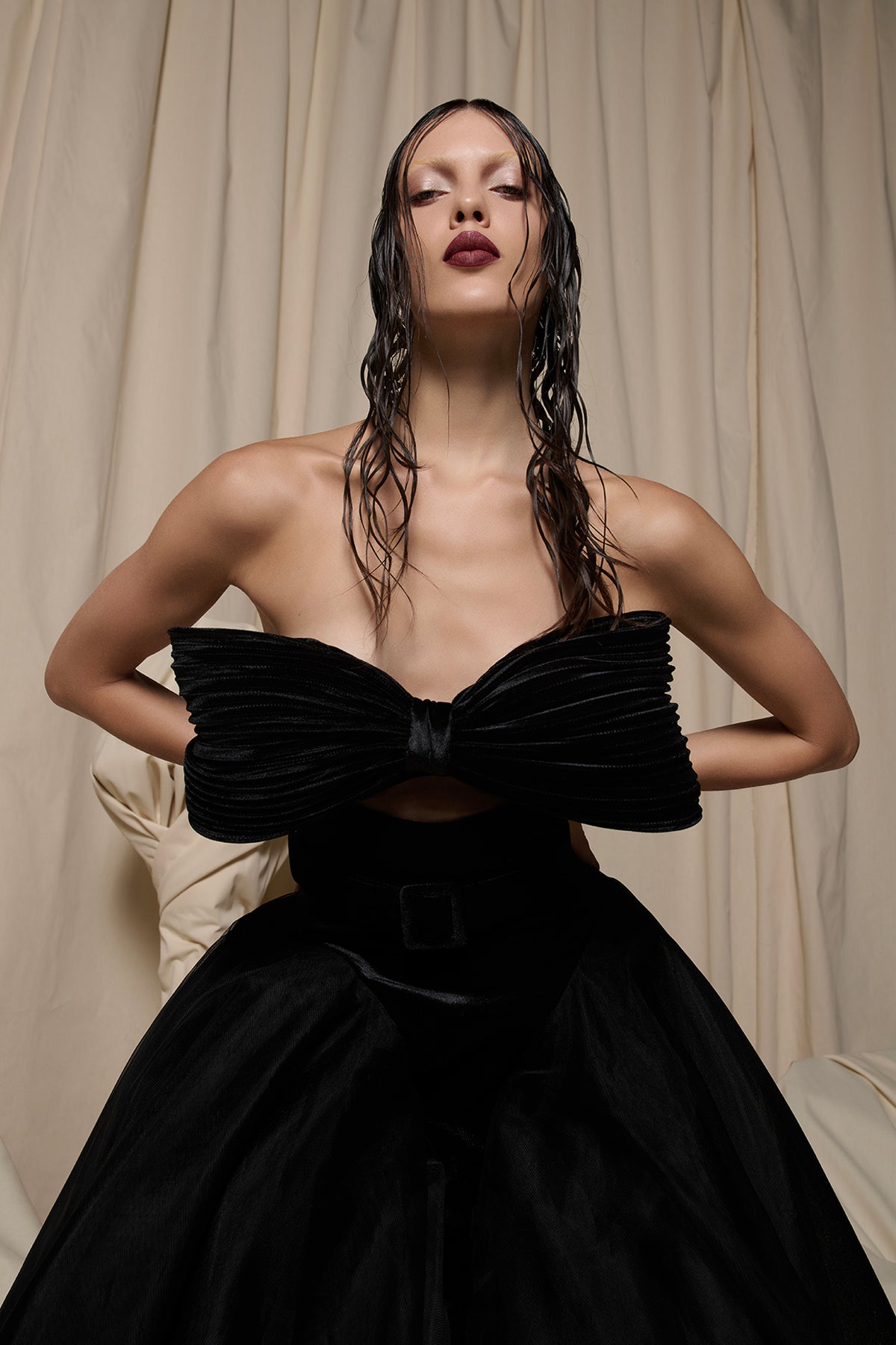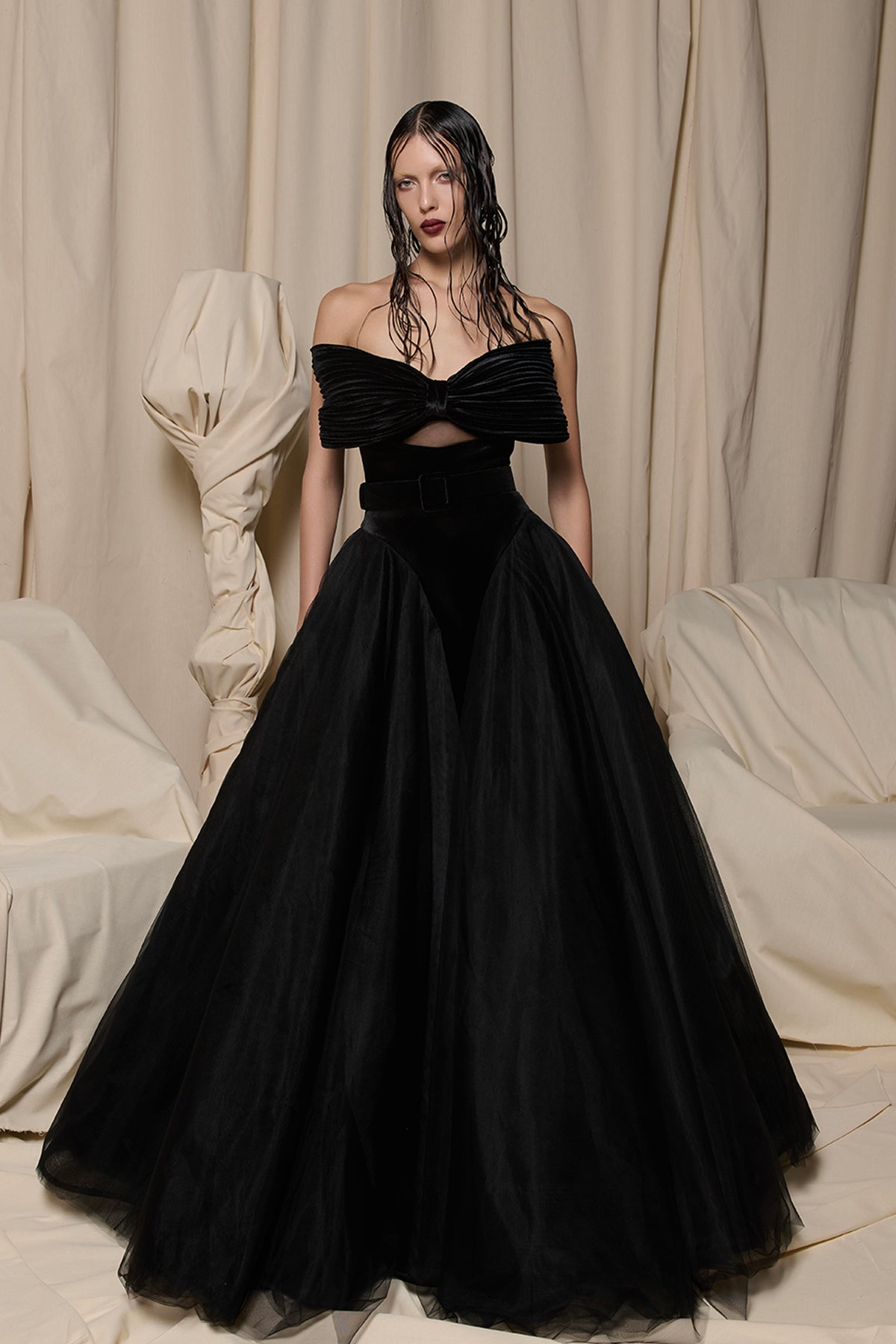 Black soft tulle a-line long dress. Featuring a strapless bodice with a sculpted oversized velvet bow with a subtle cutout beneath. Complemented with a wide velvet belt defines the waist with a full tulle skirt.