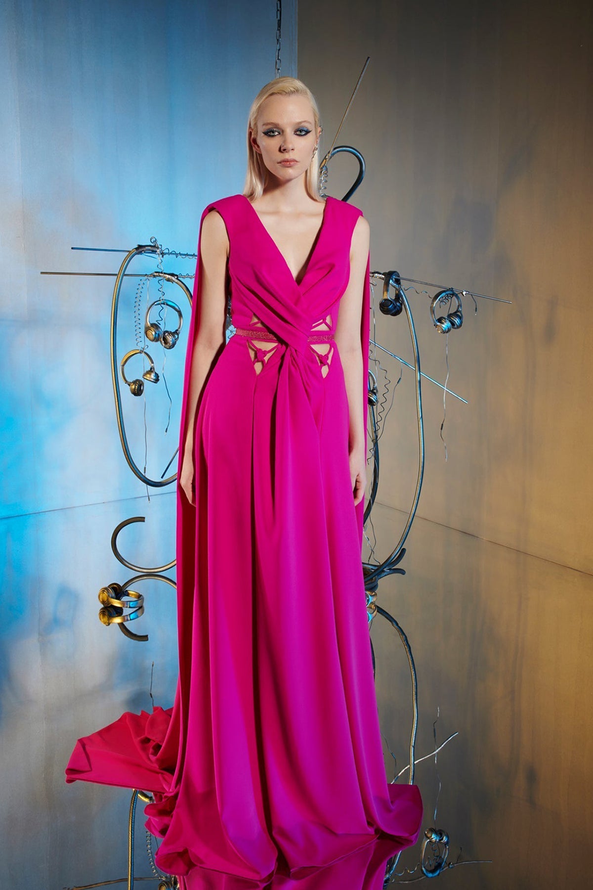 Fuchsia V-neck light crepe dress. Featuring a draped knot, light crepe silhouette, flared, floor-length. Complemented with a draped knot on the waist.