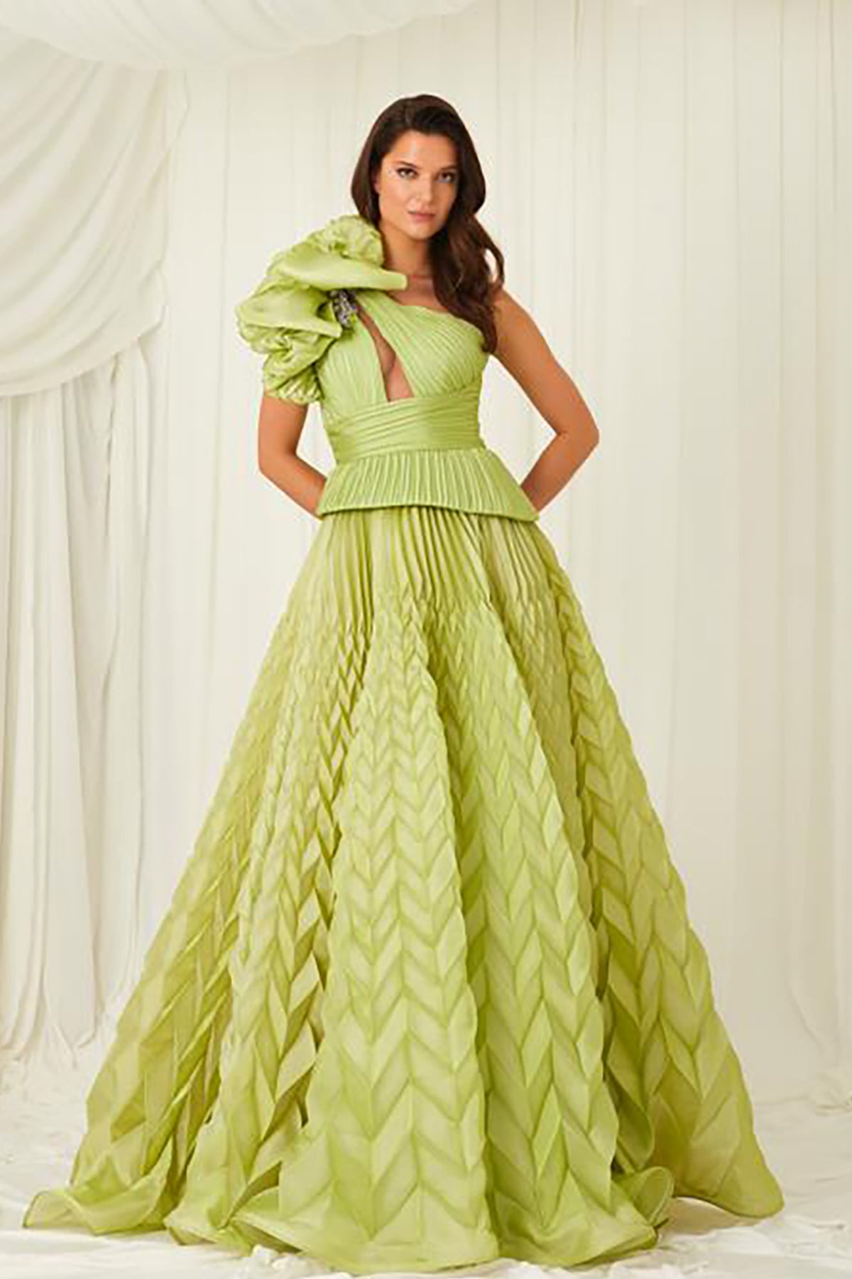 Pistachio high-end tafta and organza dress. Featuring an asymmetrical neckline cut, draped bust and waist embellishments with a tassel on the shoulder. Complemented with a plisse tail a body-hugging fit and a flared plisse skirt.