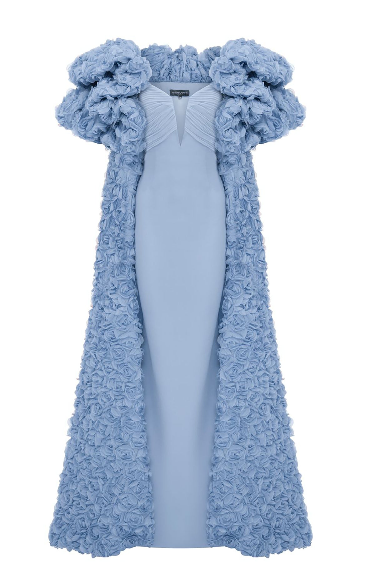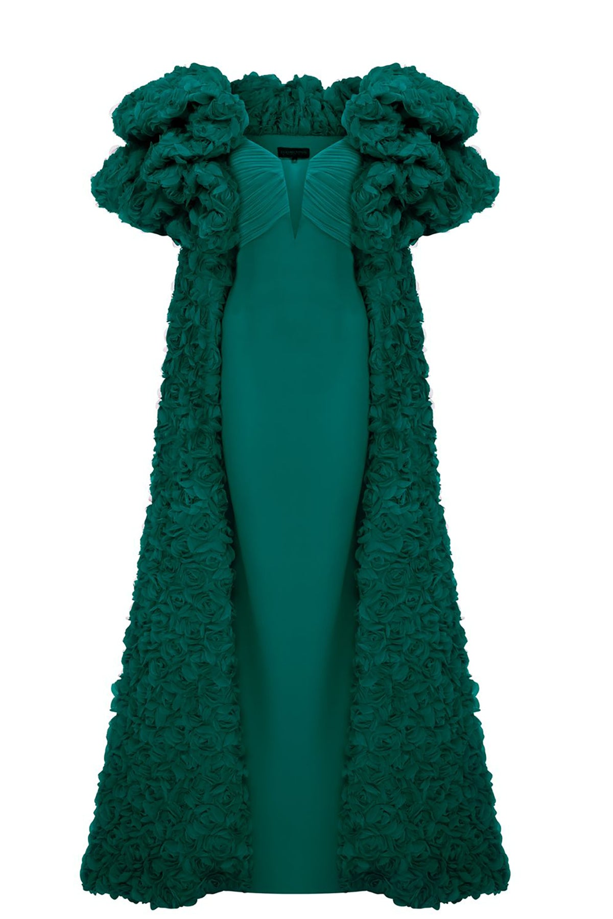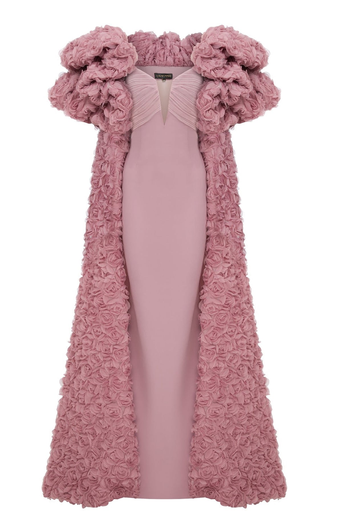 Red crepe and Organza dress. Featuring a strapless V-neckline upper cut and a Roman classic skirt a draped bust. Complemented with a cape embroidered with full flowers attached to the sleeves.