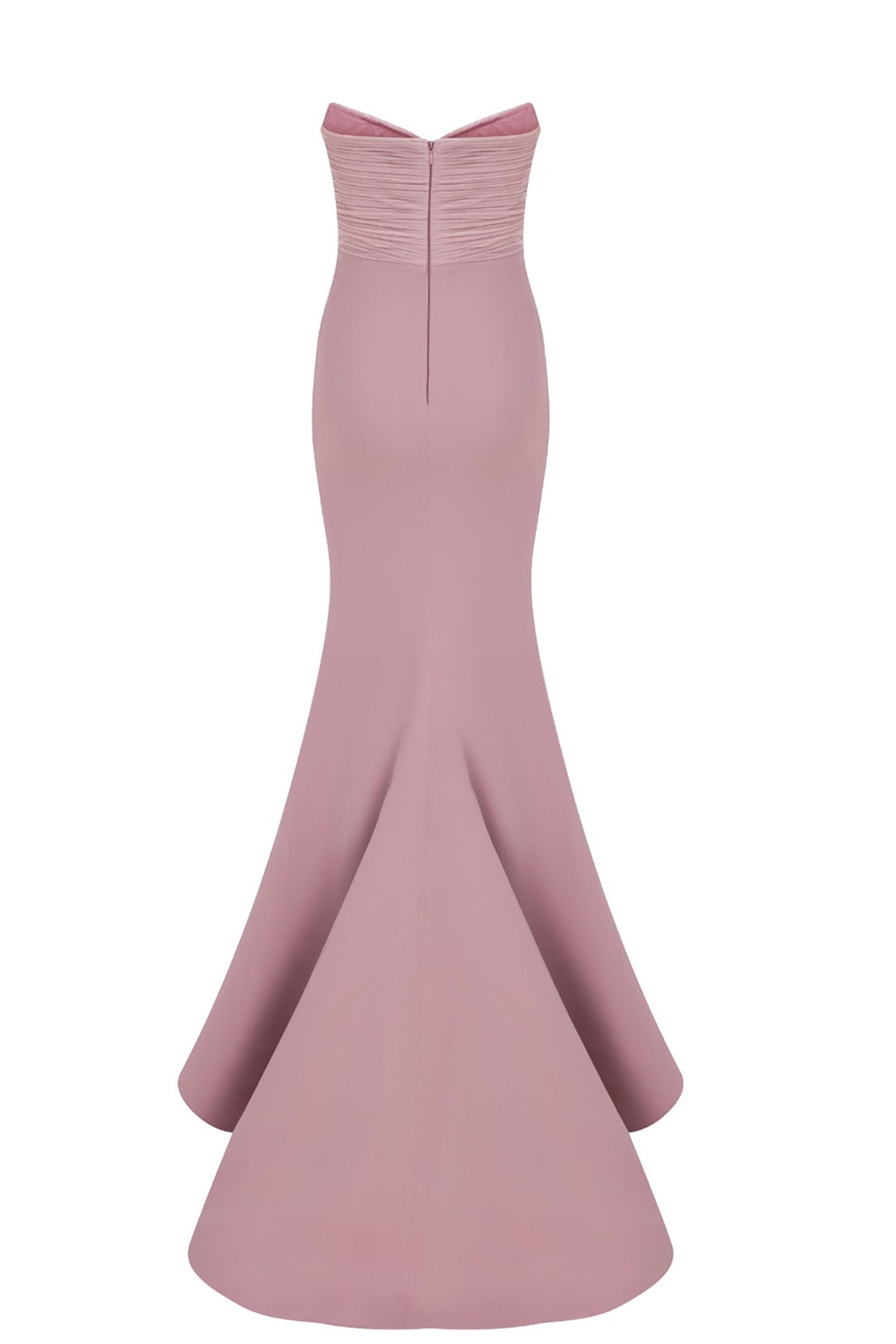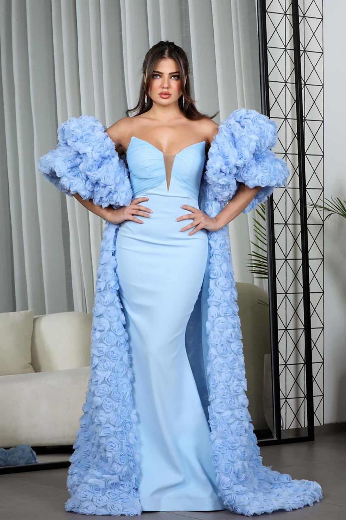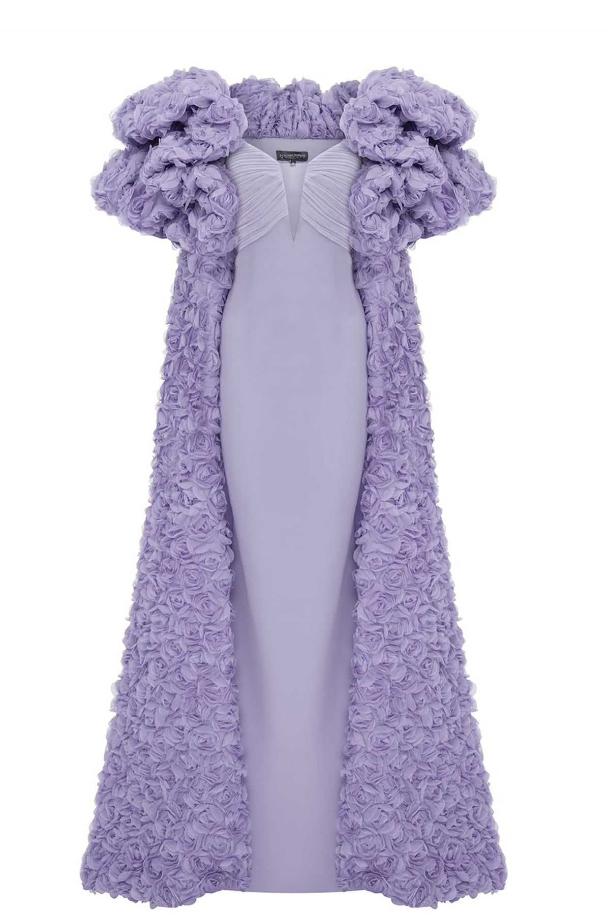 Red crepe and Organza dress. Featuring a strapless V-neckline upper cut and a Roman classic skirt a draped bust. Complemented with a cape embroidered with full flowers attached to the sleeves.