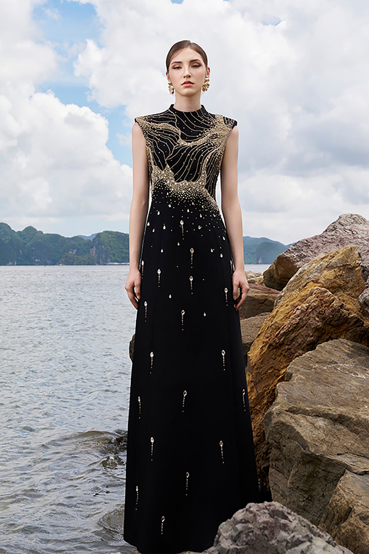 Black velvet satin dress. Featuring a high neck with sleeveless and fitted waist. Complemented with an A-line skirt and a floral crystal-embellished neckline at the chest. Completed with a stylized crystal-embellished and a zipper at the back.