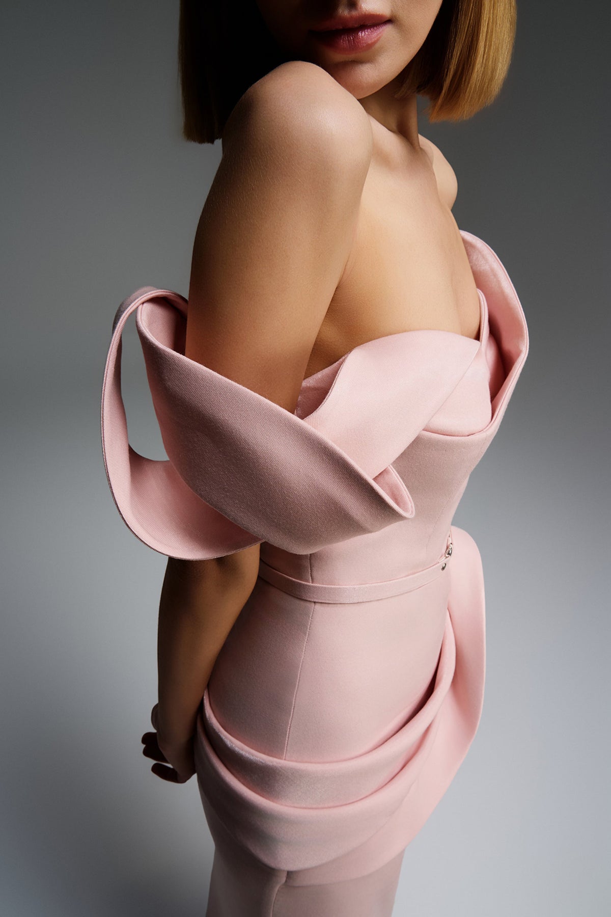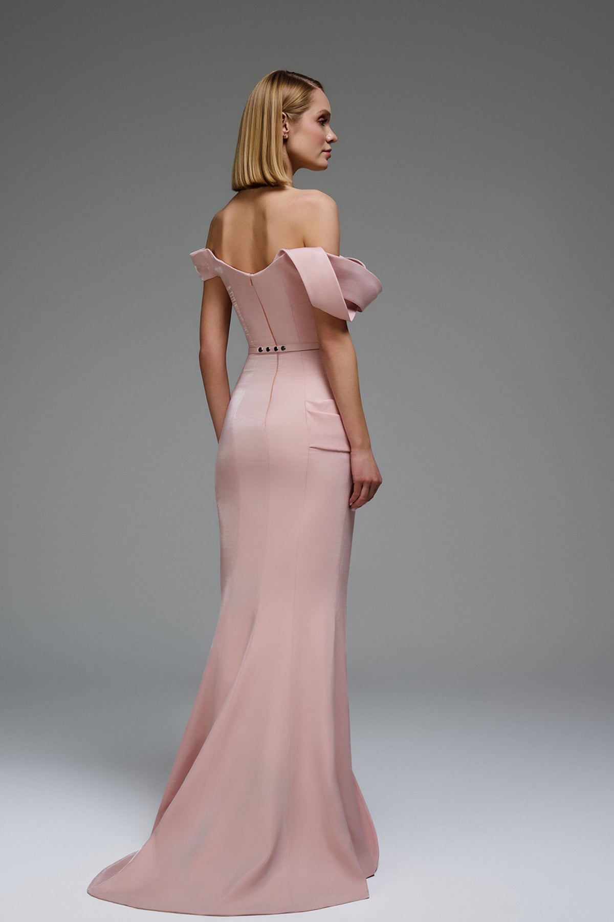 Blush pink A-line satin long dress. Featuring floor-length with an off-the-shoulder neckline with delicate, draped ruffle accents that softly frame the décolletage and shoulders.