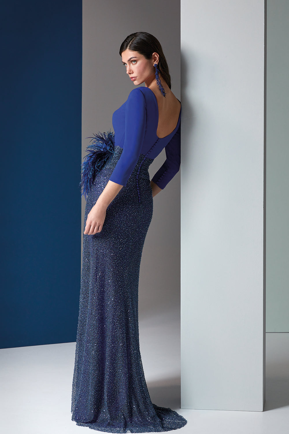 Bateau Neck Long Guest Dress with Crystal Detail