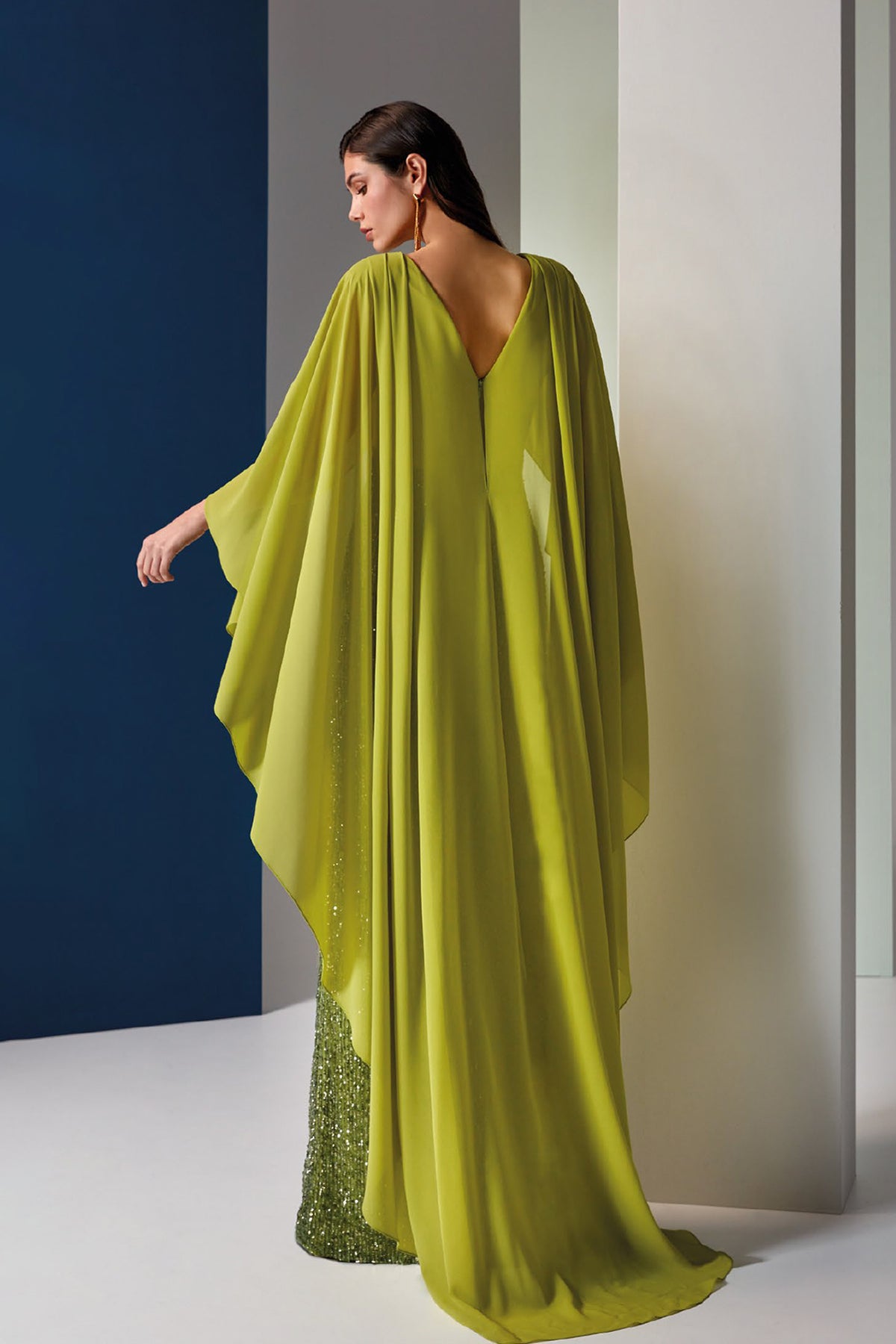 Light green flattering long dress. Featuring a skirt crystal‑embroidered tulle with high waist and pointed hem. Complemented with a bodice chiffon draped V‑neckline the back is high and is crafted in cape sleeves.