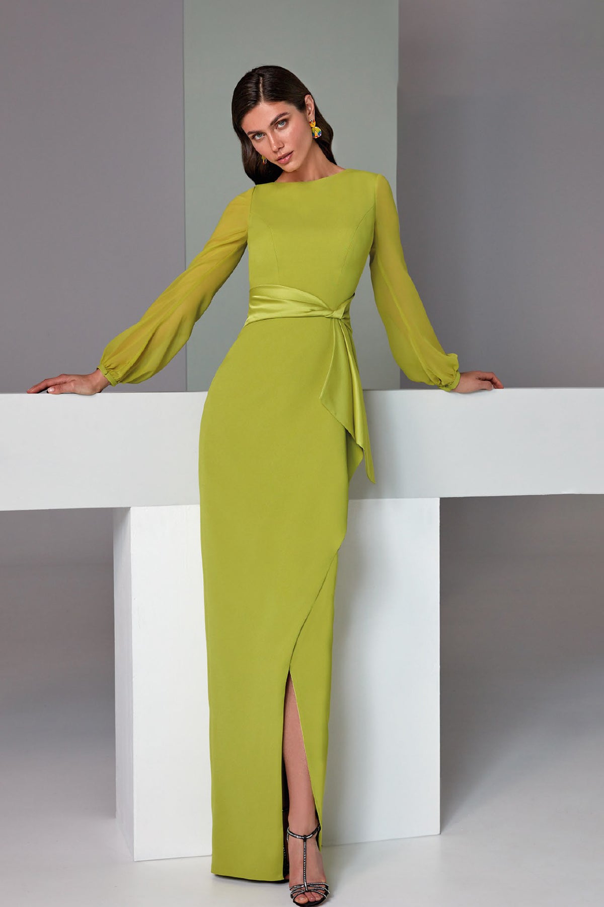 Light green long satin‑crepe dress. Featuring a bateau neckline open back and puff sleeves with a waist adorned with an asymmetrical draped sash. Complemented with a leads to a sheath skirt with a wide front slit.