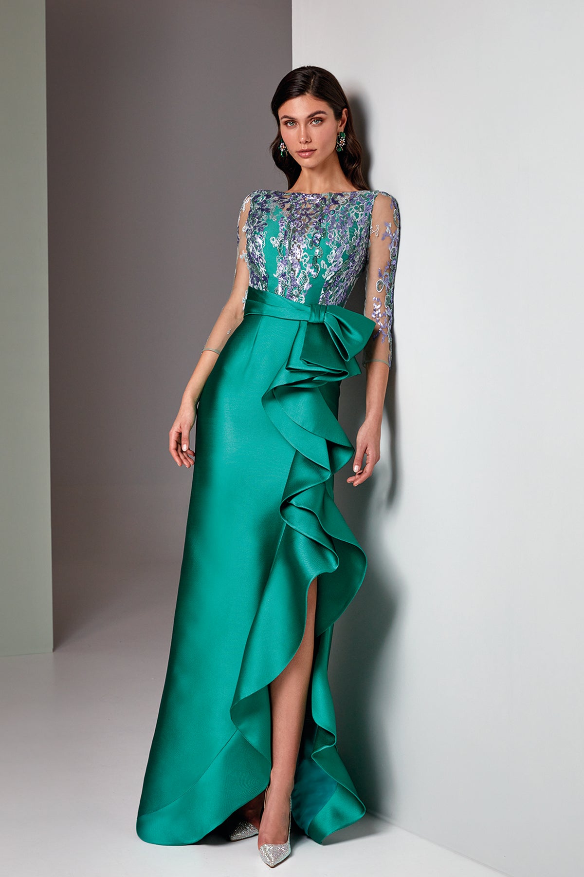 Green pique mermaid long dress. Featuring a jewel neckline with a fitted silhouette and three-quarter sleeves.