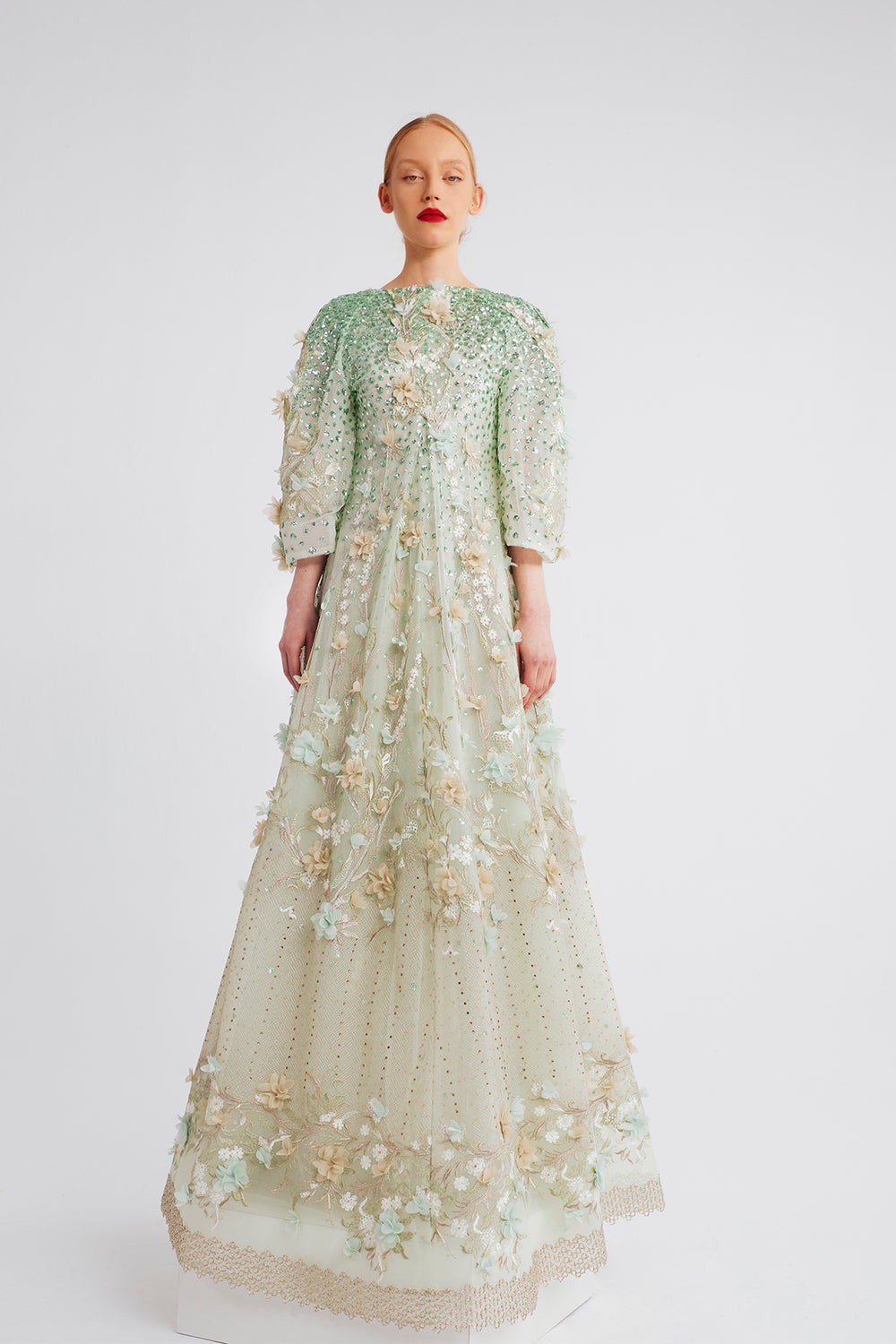 Long-Sleeve Mermaid Dress with Leaf Motif