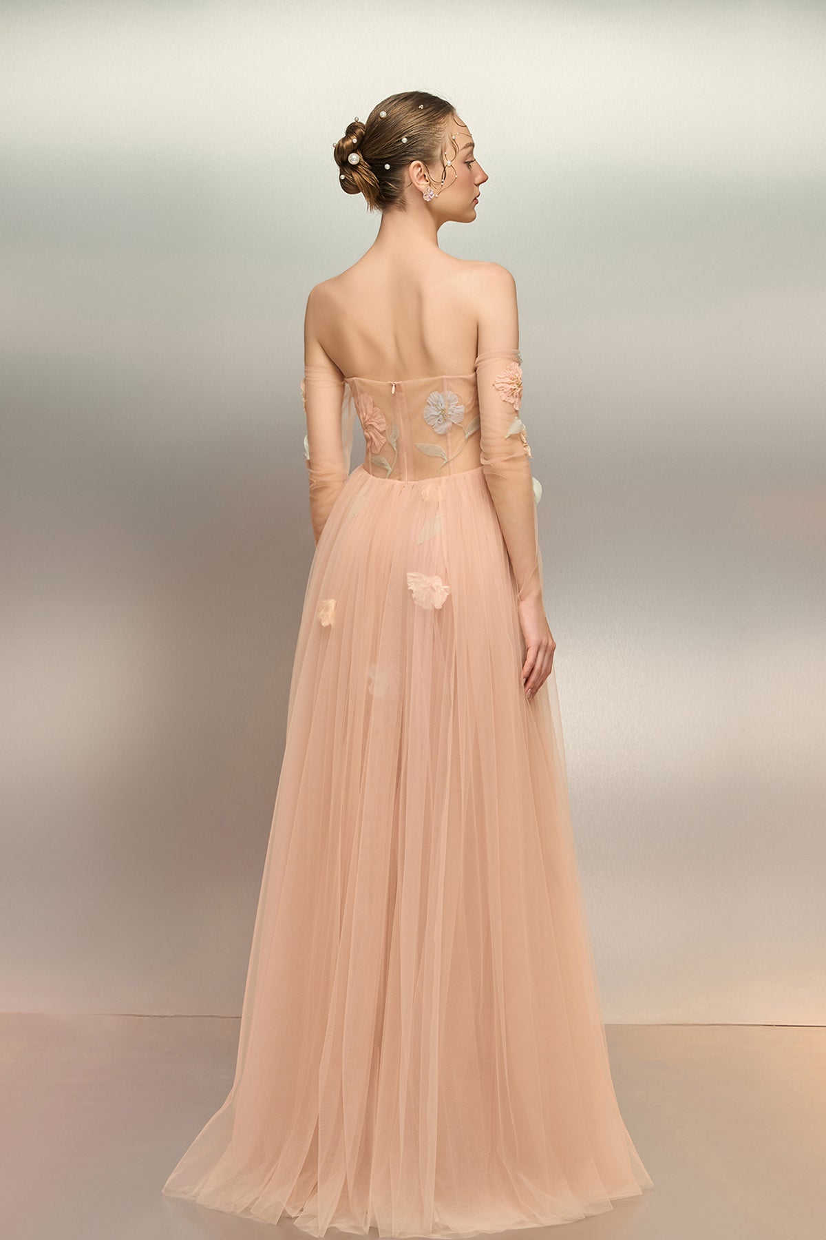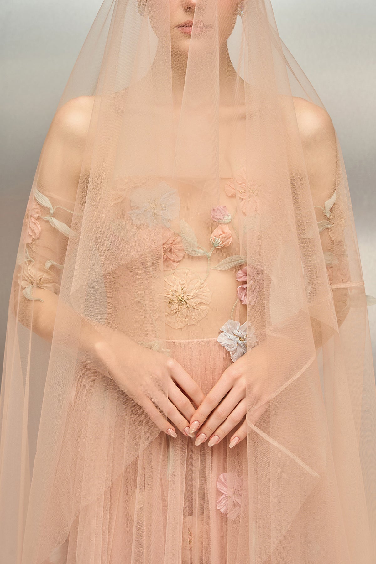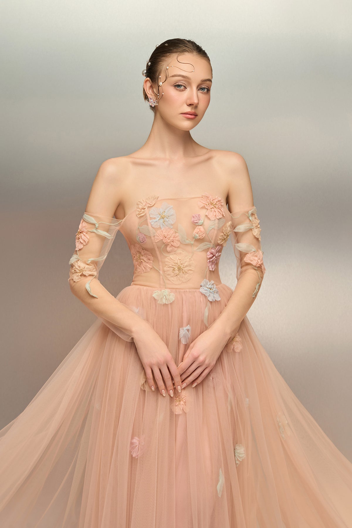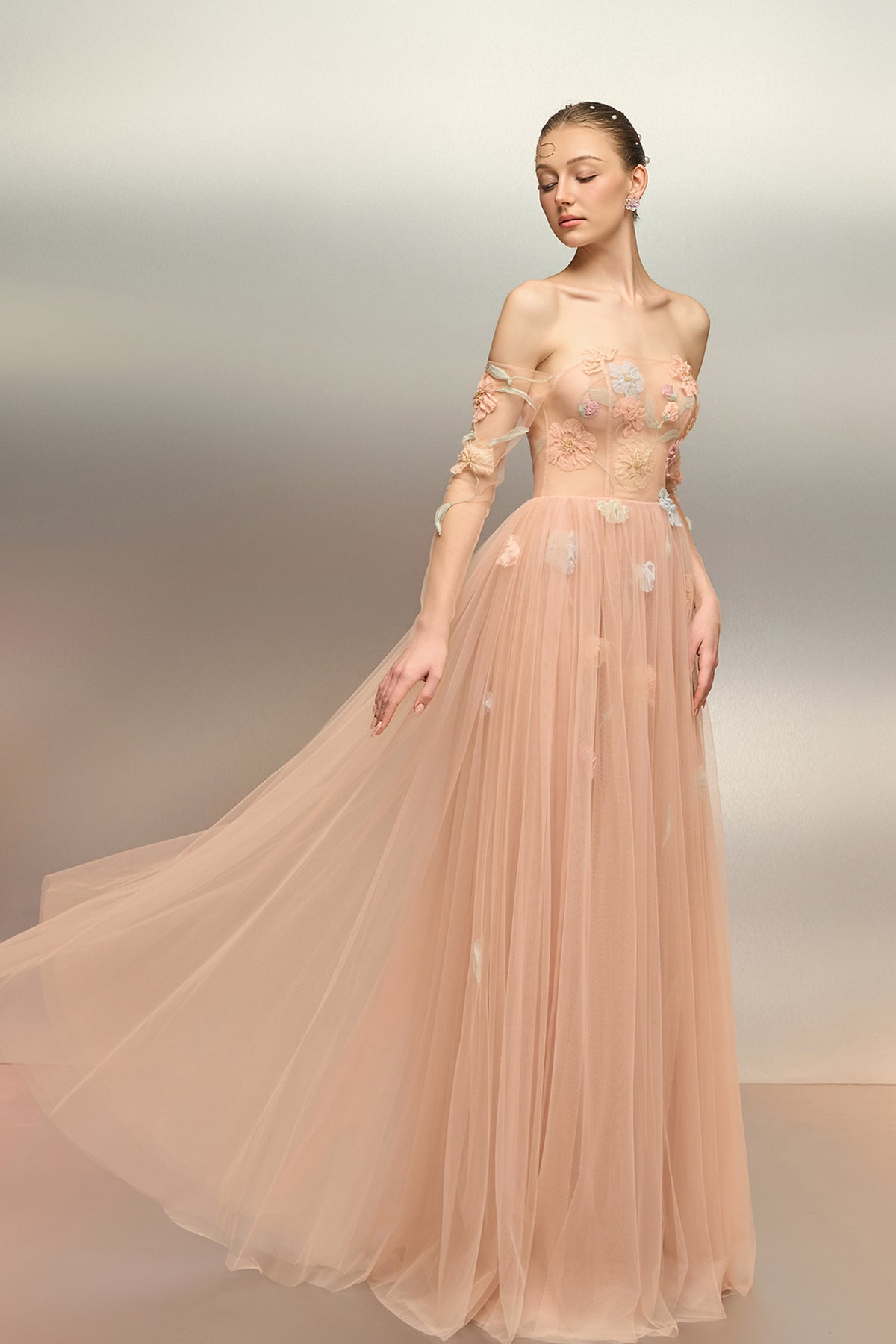 Light pink long A-line dress. Featuring a fitted bodice with a sweeping multi-layered tulle skirt the silhouette emphasises an hourglass shape while remaining light and airy in movement. Complemented by sculpting the waist and torso while allowing the skirt to flare below the hips.