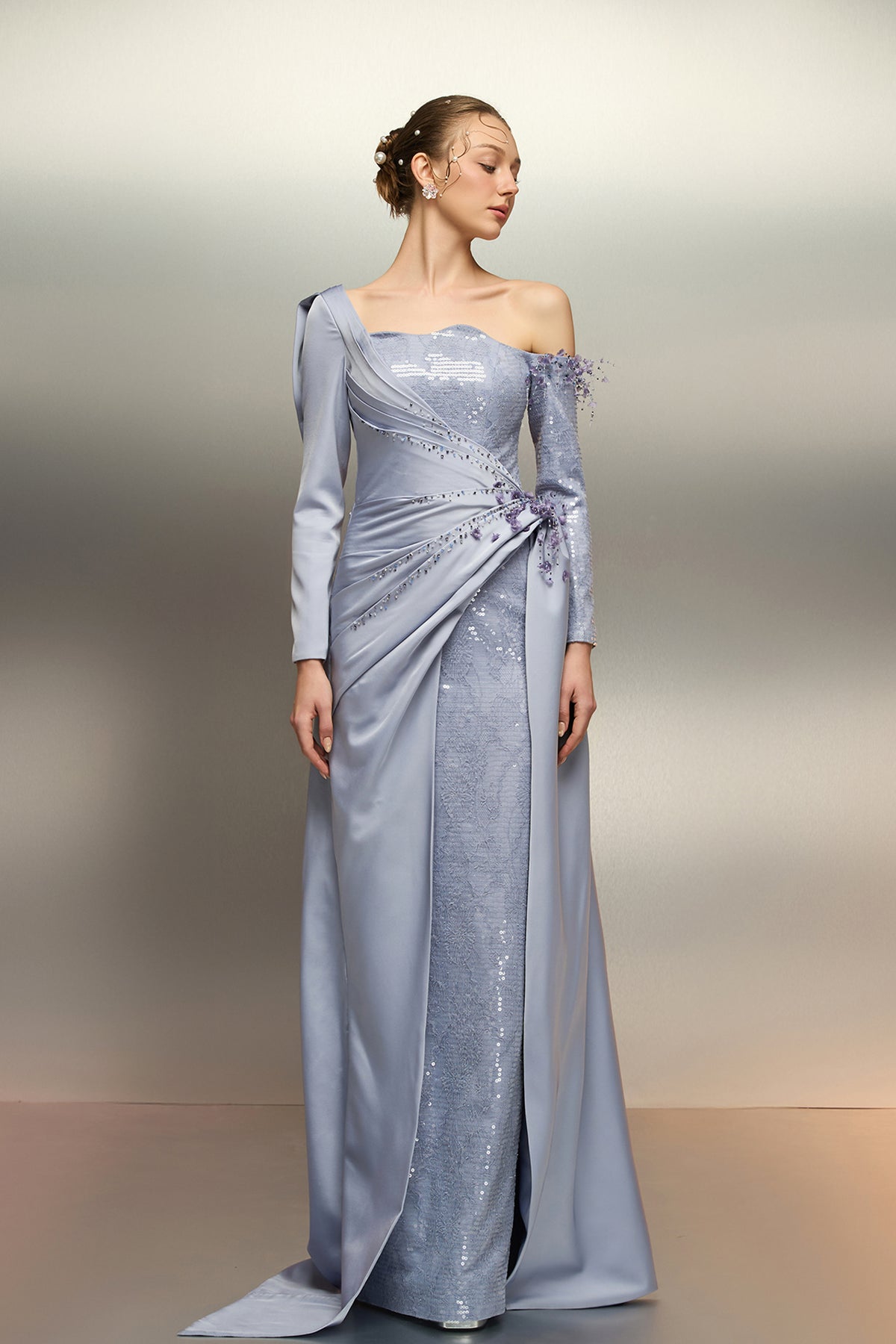 Light ice-blue satin long dress. Featuring a column cape-like extension, an asymmetric draped off-the-shoulder design exposes one shoulder and collarbone, while the other is covered by a full-length sleeve. Complemented with a fitted through the torso with carefully placed pleats.