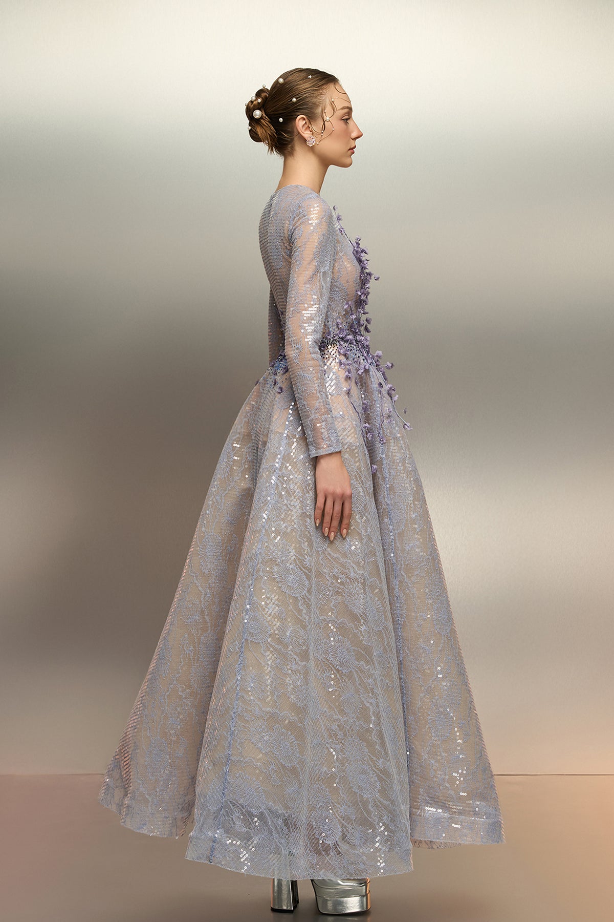 Blue caroline sequin midi dress. Featuring an A-line silhouette with a fitted bodice designed with a refined round neckline and long sleeves. Complemented with a highlight of the dress in the hand-applied 3D floral embellishments cascading from the bust to the waist.