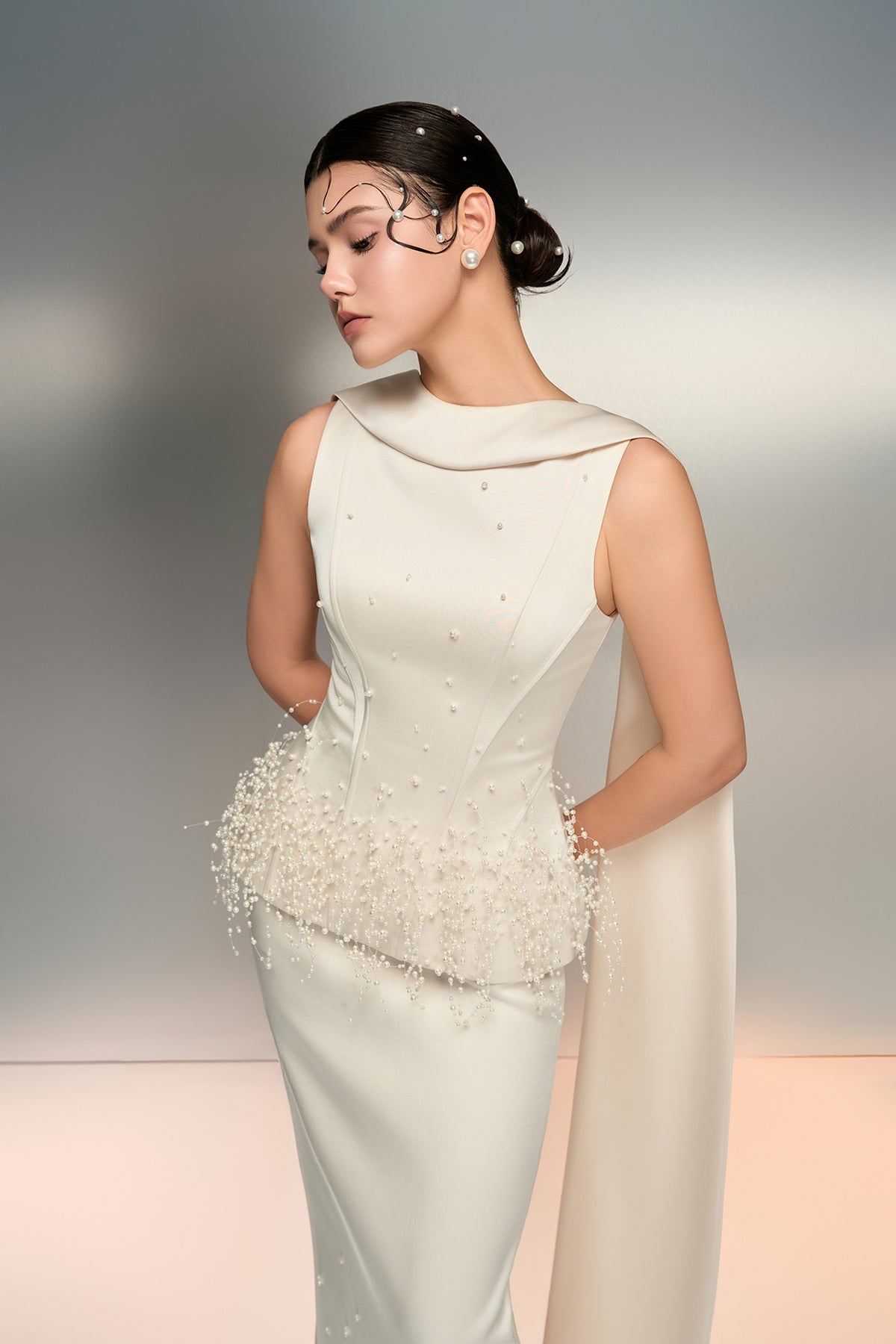 White silk taffeta column sleeveless long dress. Featuring an form-fitting silhouette with a soft high neckline with a fluid. Complemented with a detail in the meticulously hand-embellished pearls along the peplum waist and skirt hem.