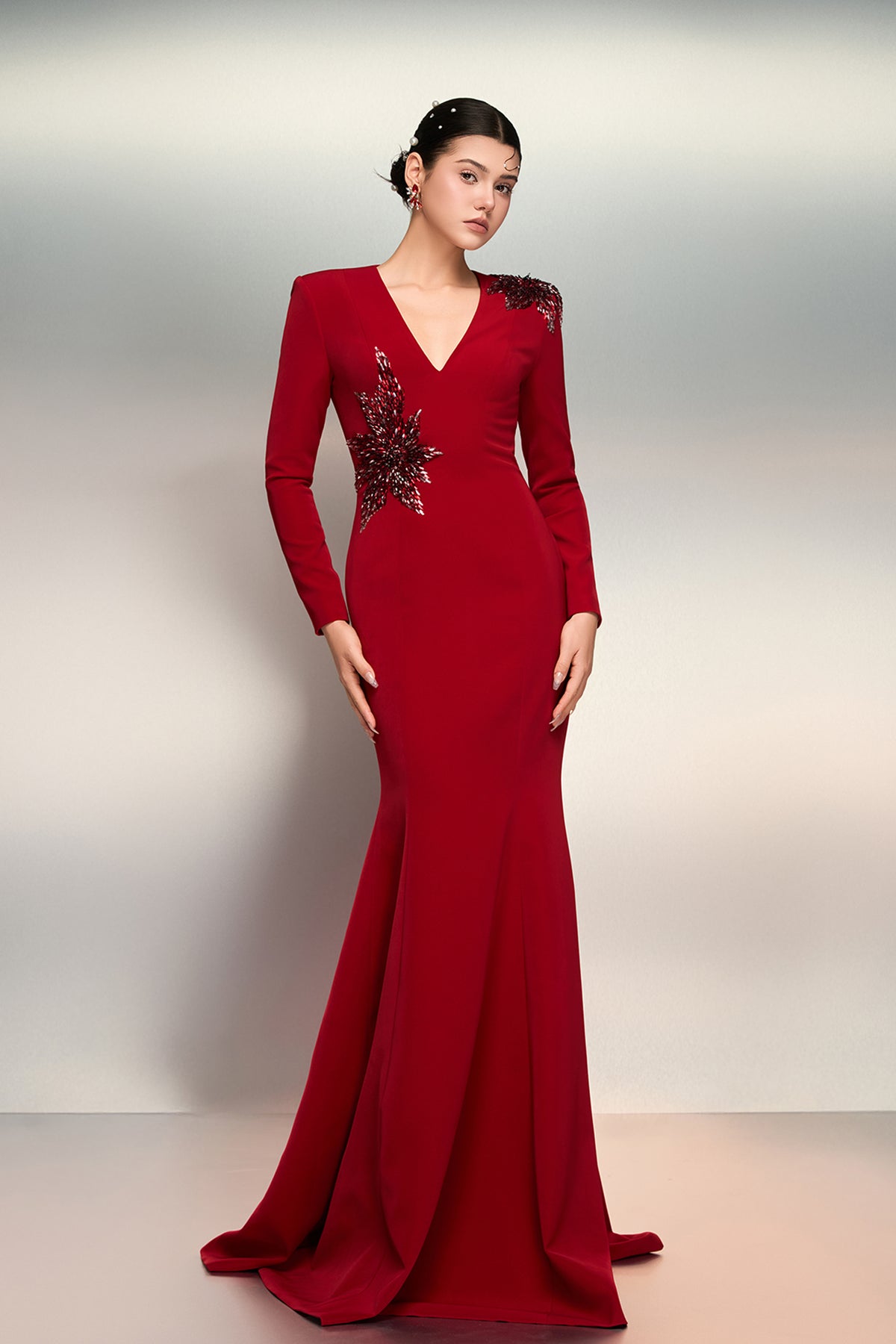 Red crepe long dress. Featuring a a figure-hugging silhouette with long sleeves and a deep V-neckline exquisitely handmade crystal embellishments on the shoulder and waist.