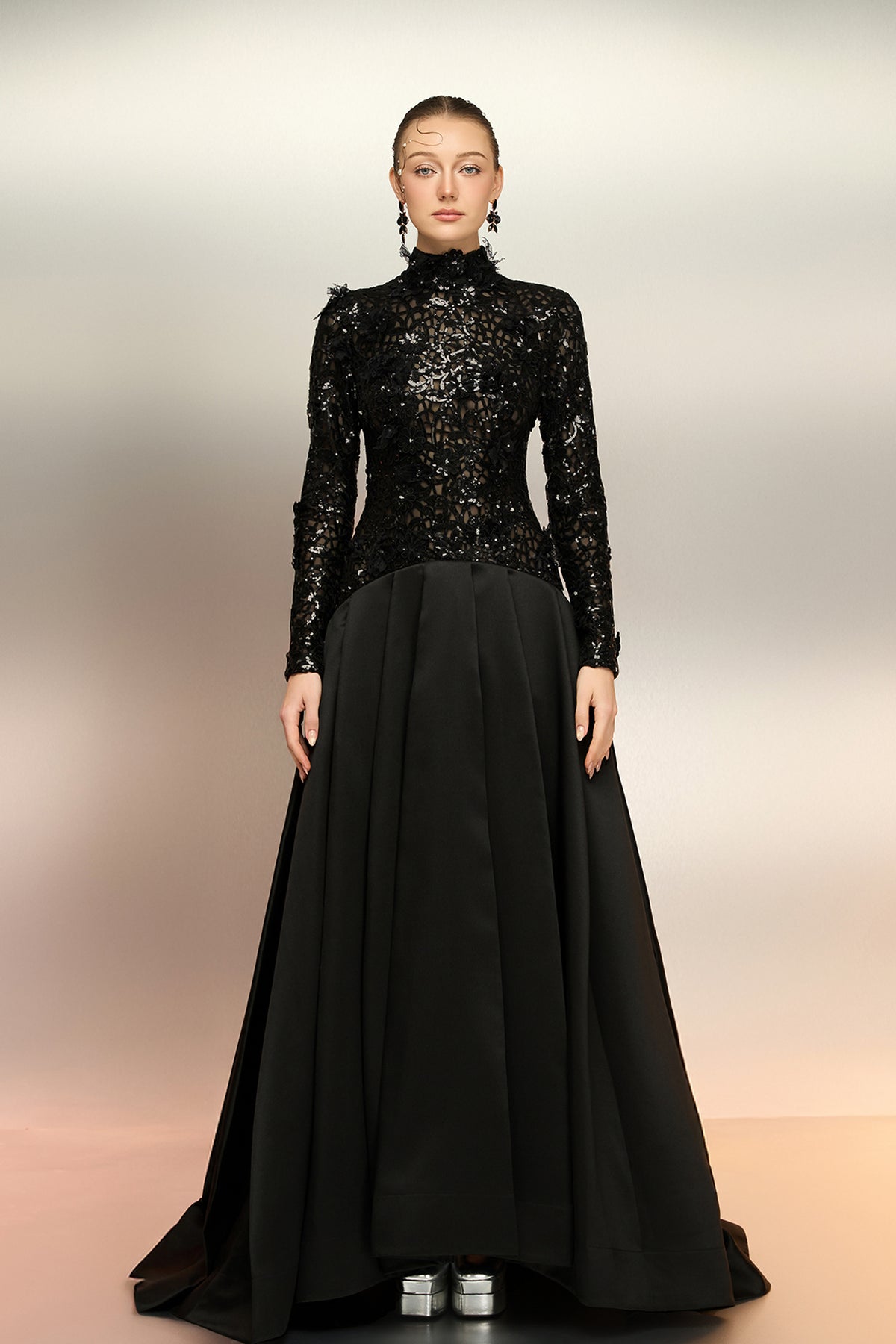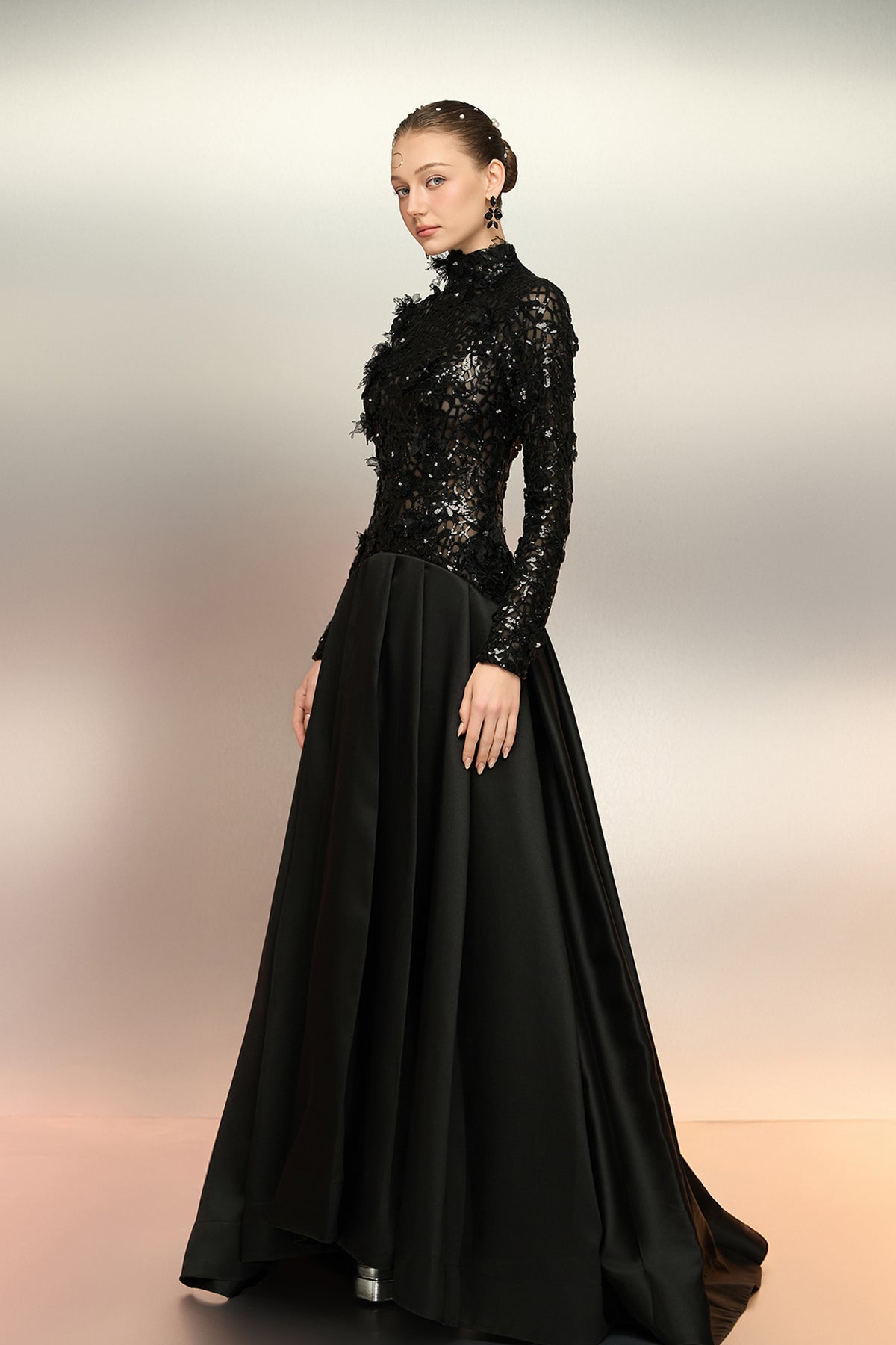 Black sheer sequin lace taffeta dress. Featuring a fitted bodice that intricate 3D floral embellishments and shimmering sequins with an a high neckline and long sleeves. Complemented with a voluminous taffeta skirt flows that creates a sense of softness.