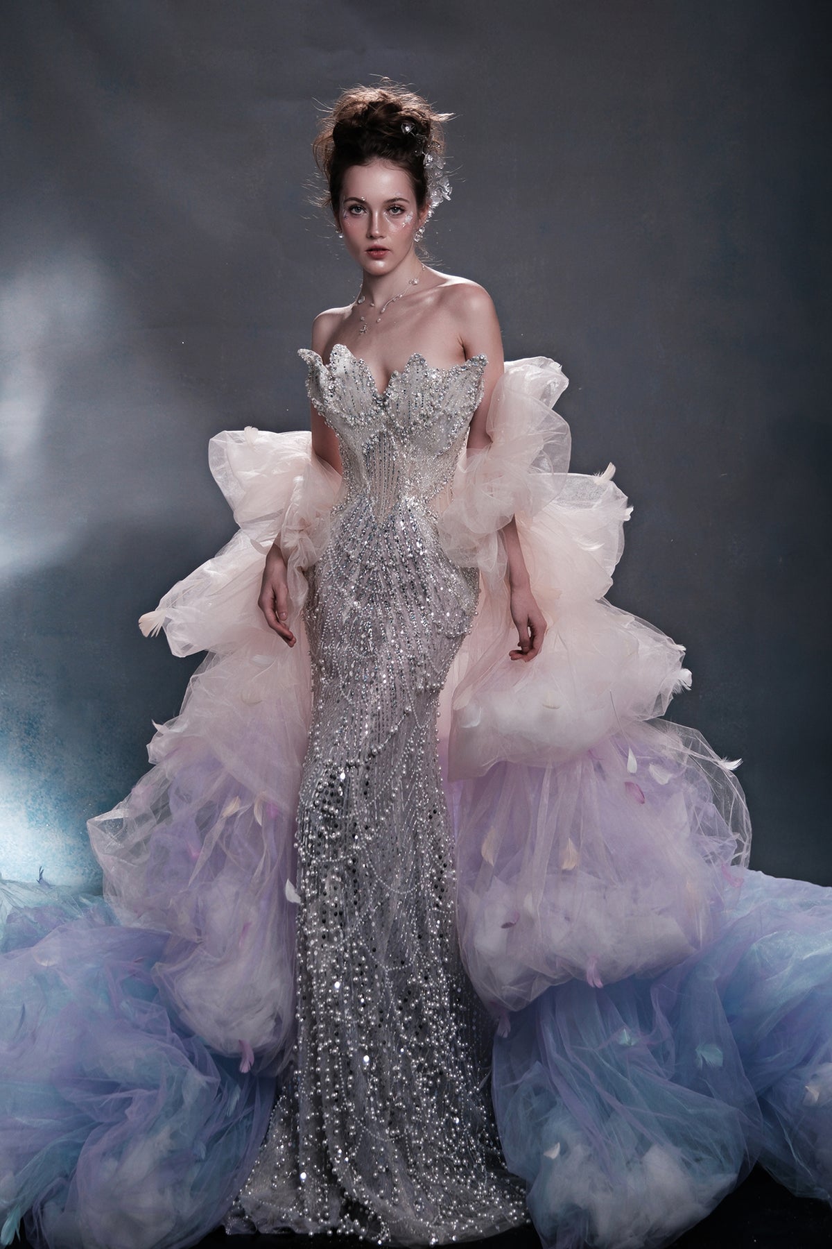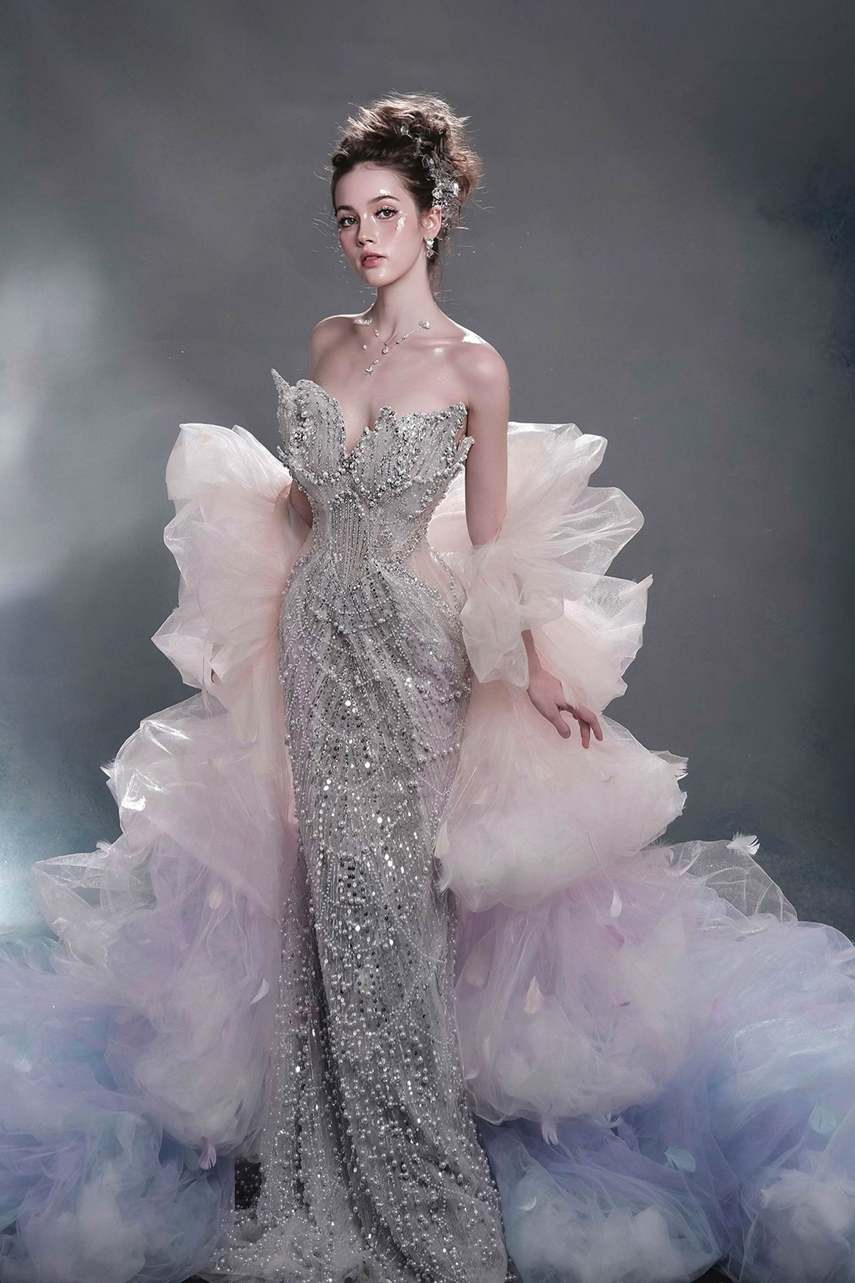 Silver column floor-length dress. Featuring a fitted silhouette through the bodice and a crystal-embellished bodice with oversized, voluminous ruffle sleeves. Complemented with a strapless sweetheart neckline that elongates the neckline and layers of tulle or organza with a sheer.