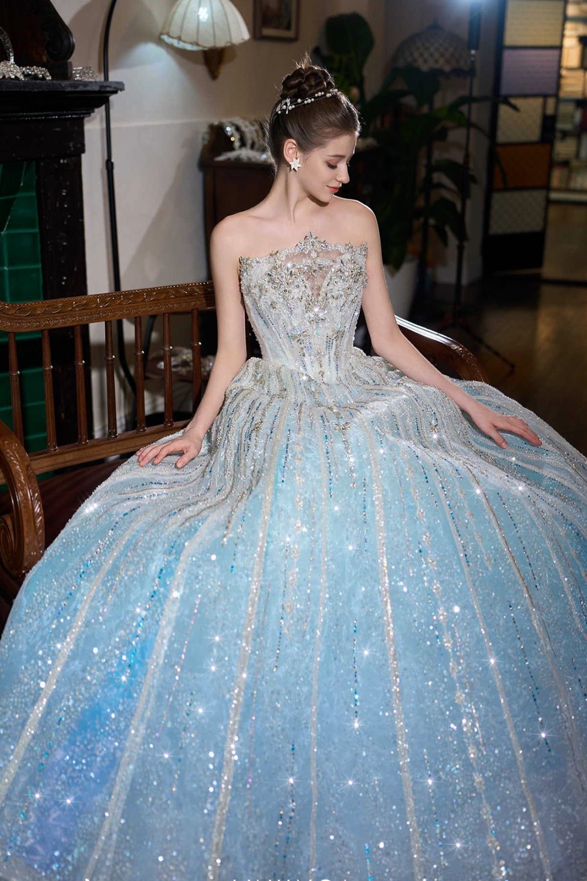 Light blue a-line long dress. Featuring a dense crystal and beadwork across the bodice and upper skirt. Complemented with a voluminous skirt is layered a strapless neckline corseted bodice that cinches at the waist.