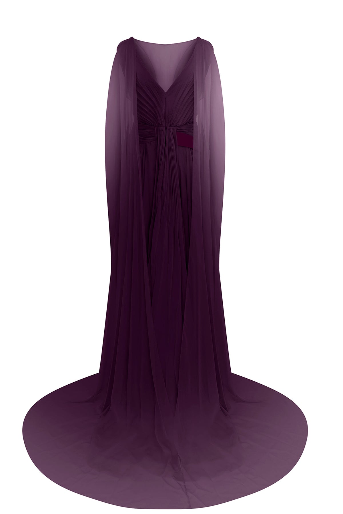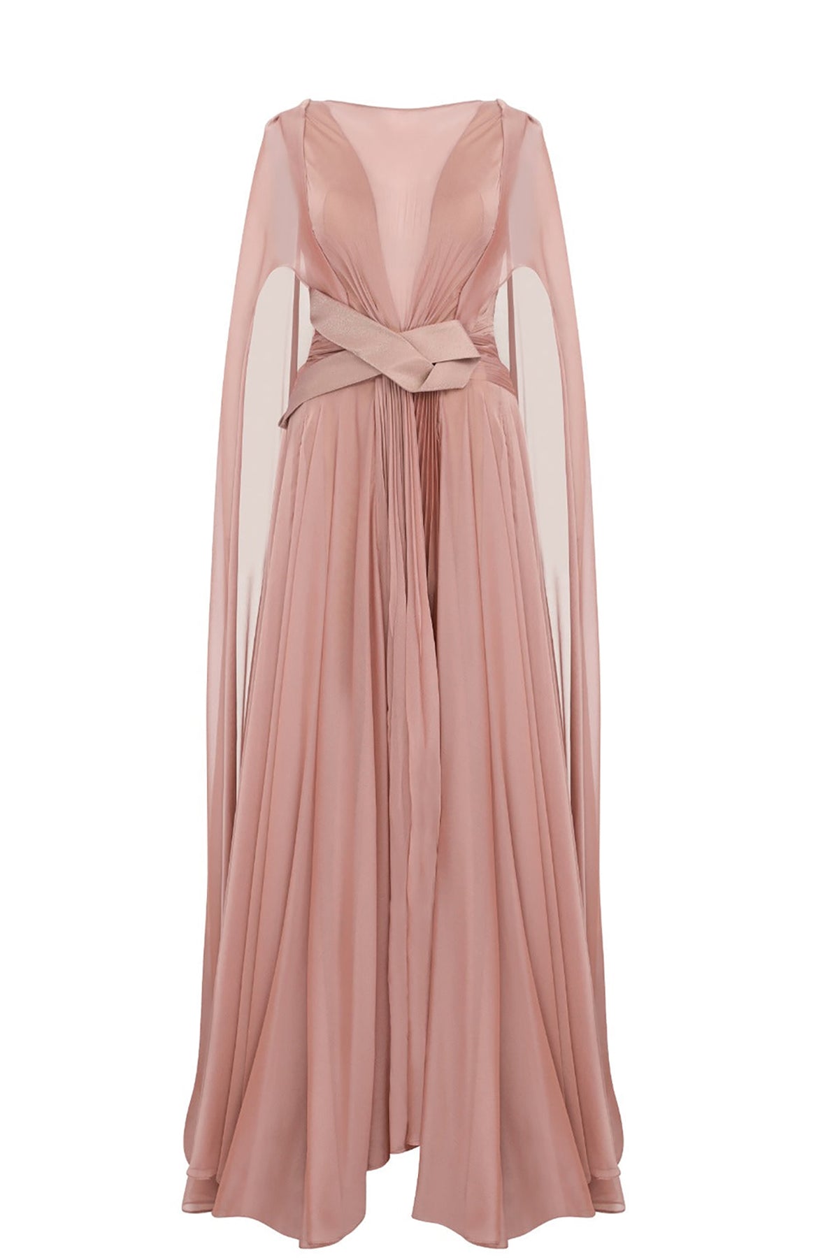 Coral chiffon illusion V-neck cut. Featuring a flared lower body cut A-line, embellished with architectural drapes on bust and waist. Complemented two long tailed sleeves, draped on the bust, long dress.