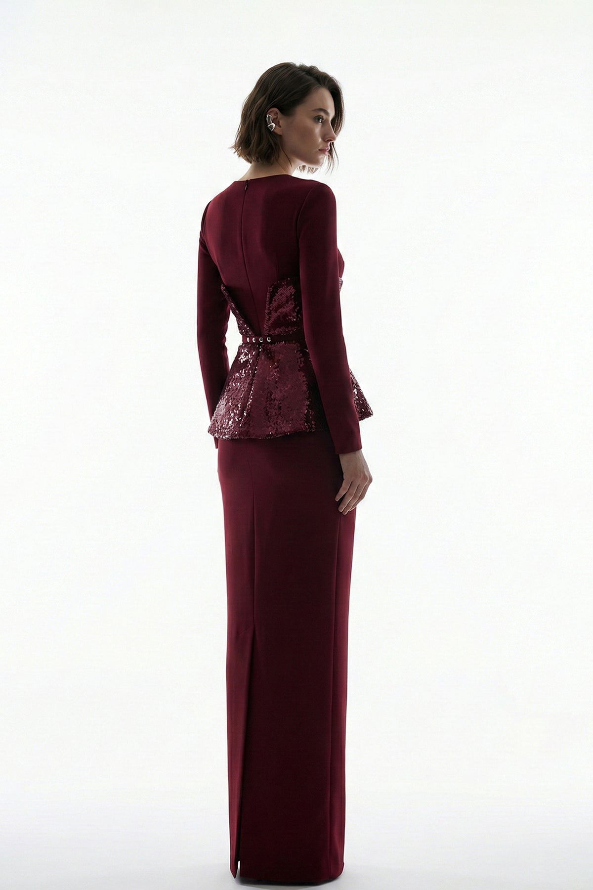 Burgundy floor-length column dress. Featuring a long sleeves with a modest neckline harmonise with the peplum overlay. Complemented with a fitted through the bodice with a defined waist.