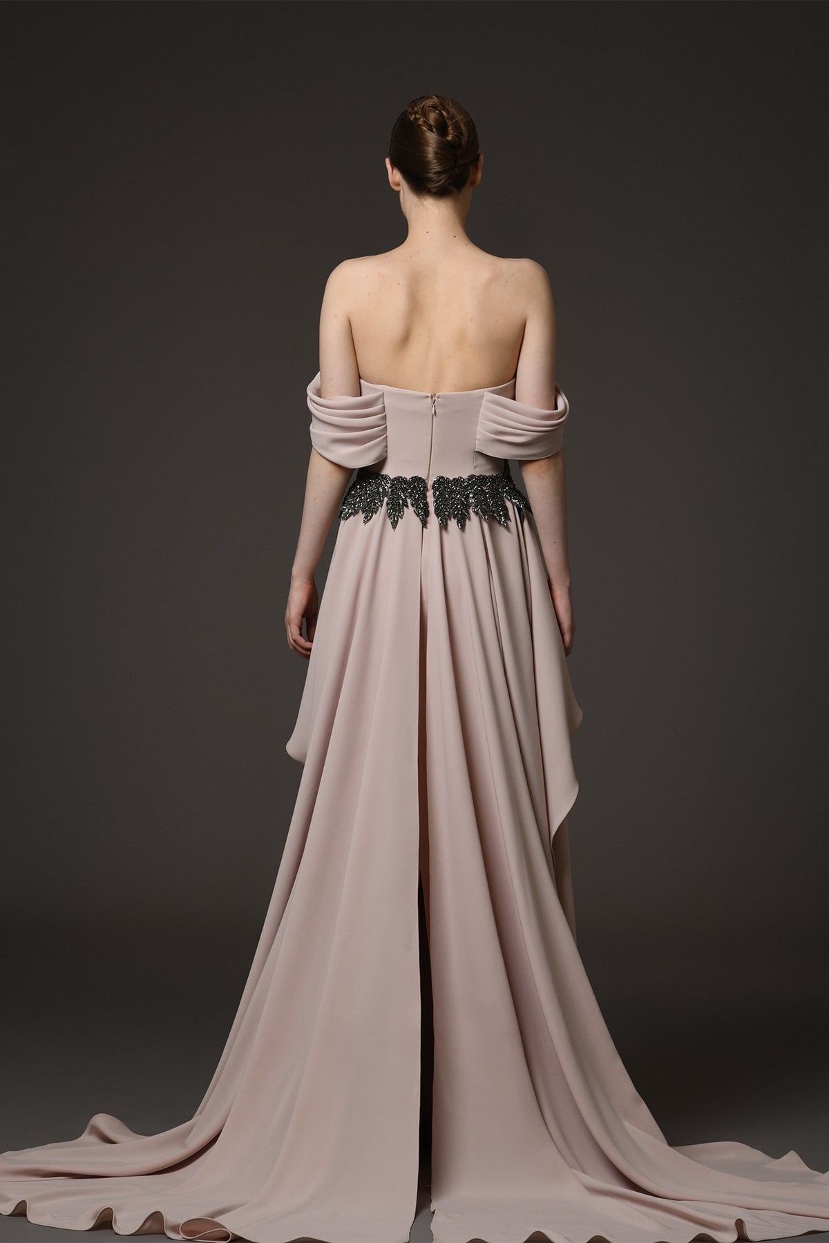 Nude crêpe long dress. Featuring off-the-shoulder crêpe overskirt. Complemented with embroidery and back slit.