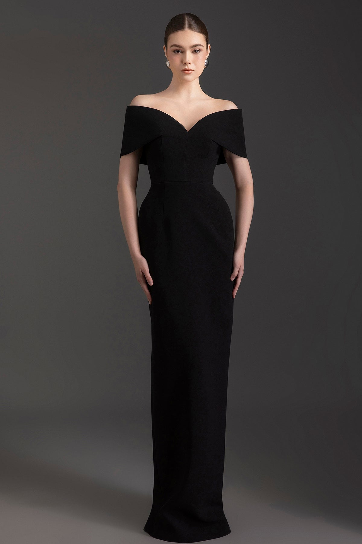 Black crepe floor-length dress. Featuring an off-the-shoulder neckline with a column long silhouette.
