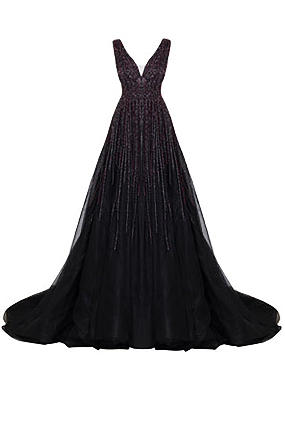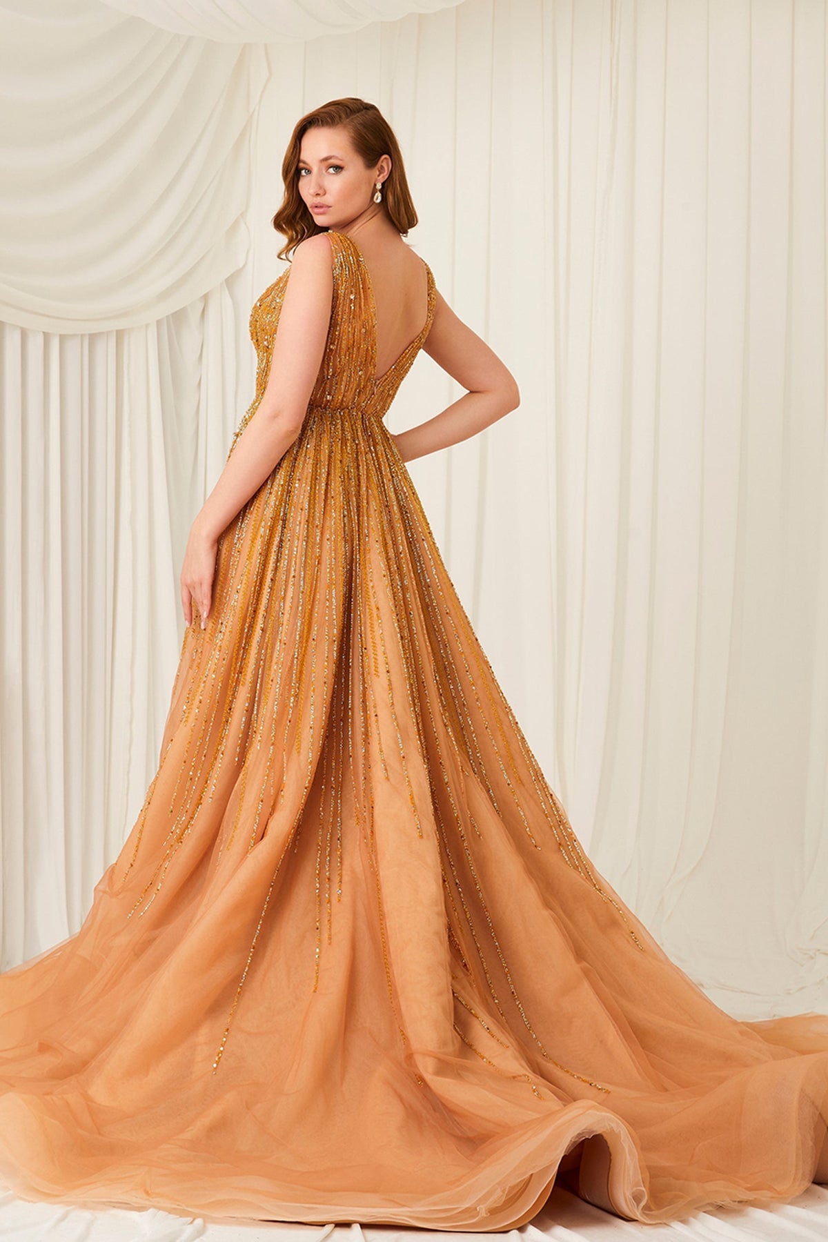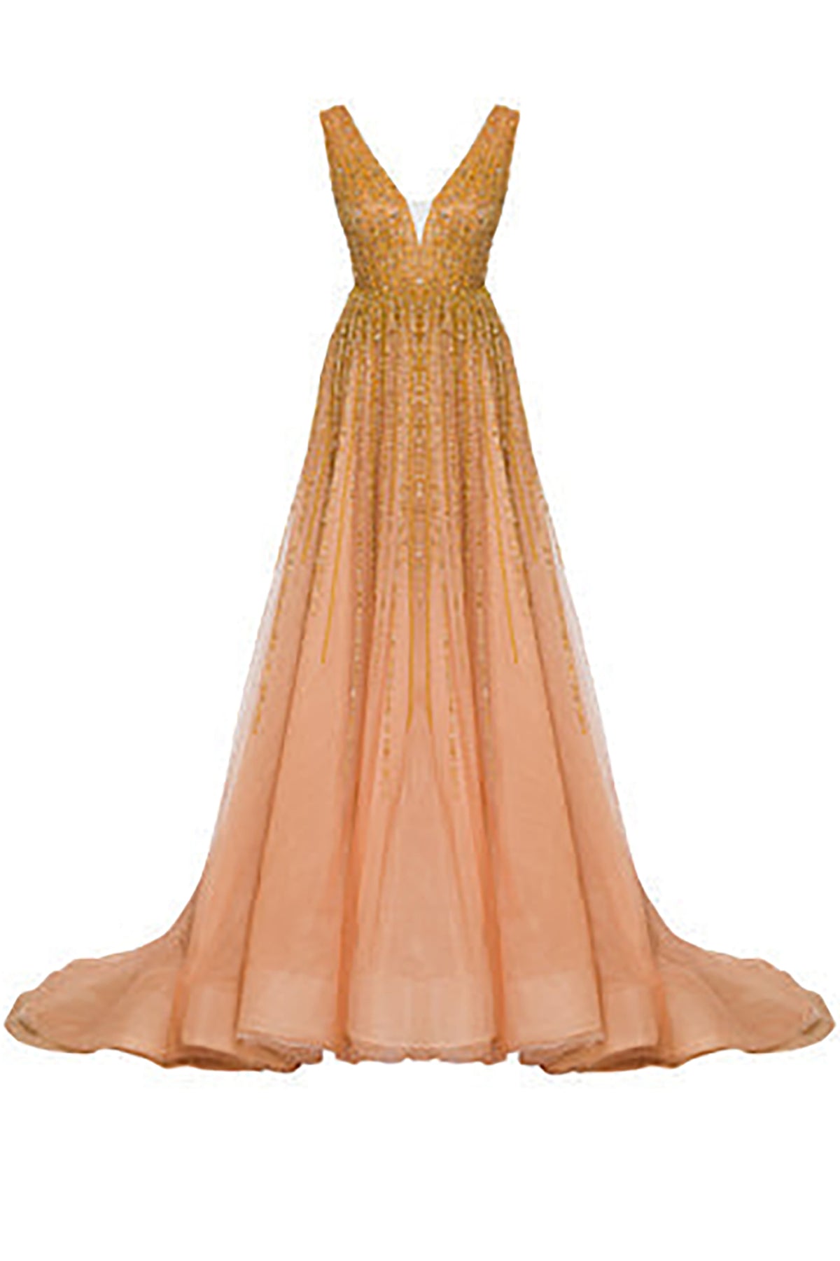 Gold long dress. Featuring a hand-beaded with crystals with a V-neckline. Complemented with a flared lower cut A-line and is fully embroidered.