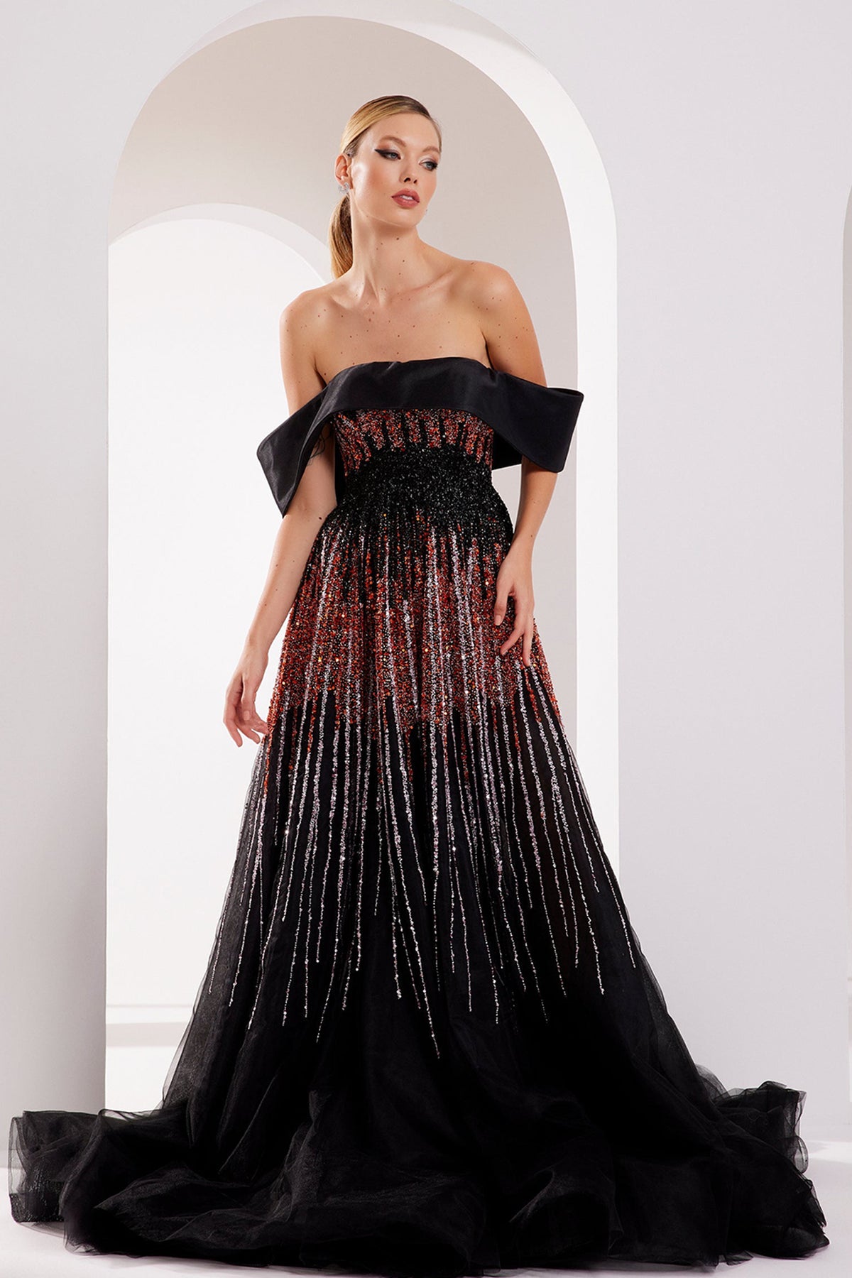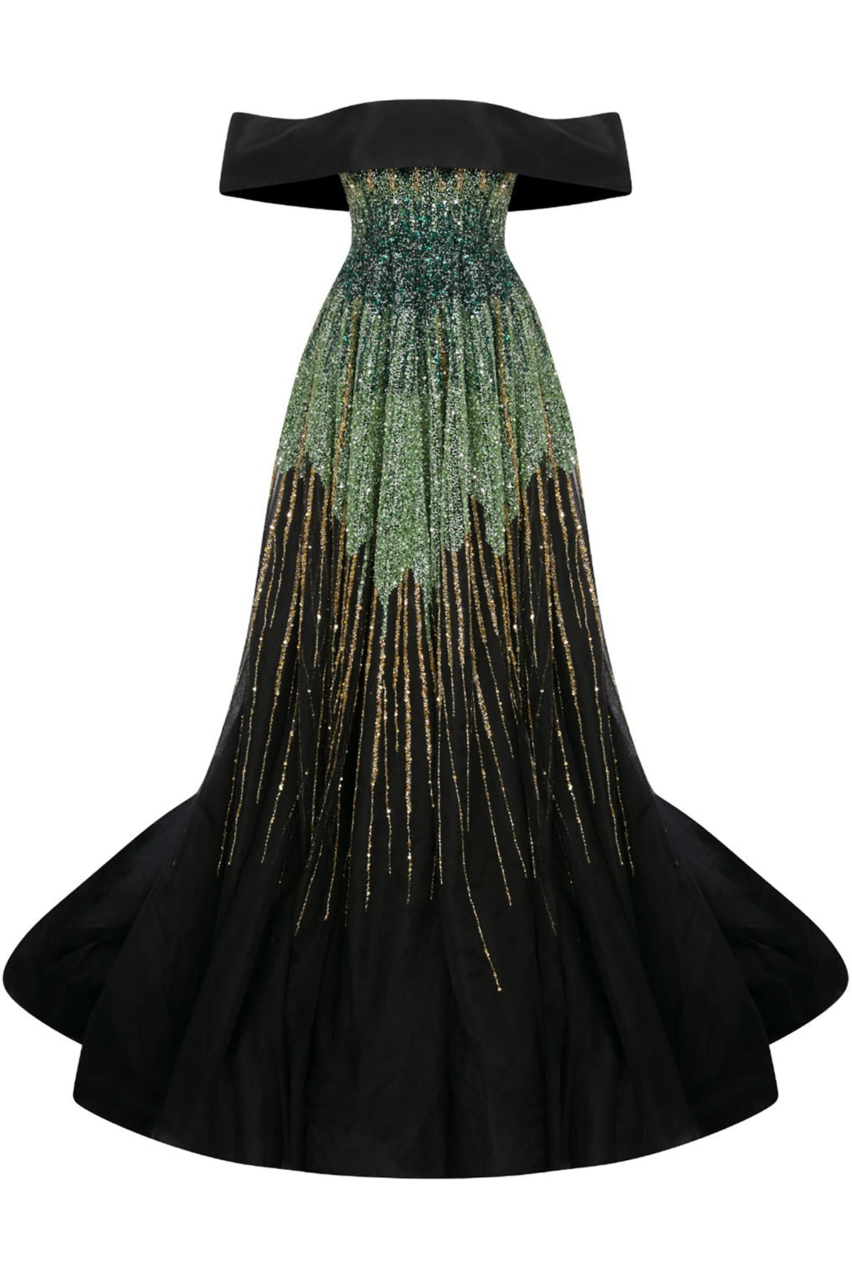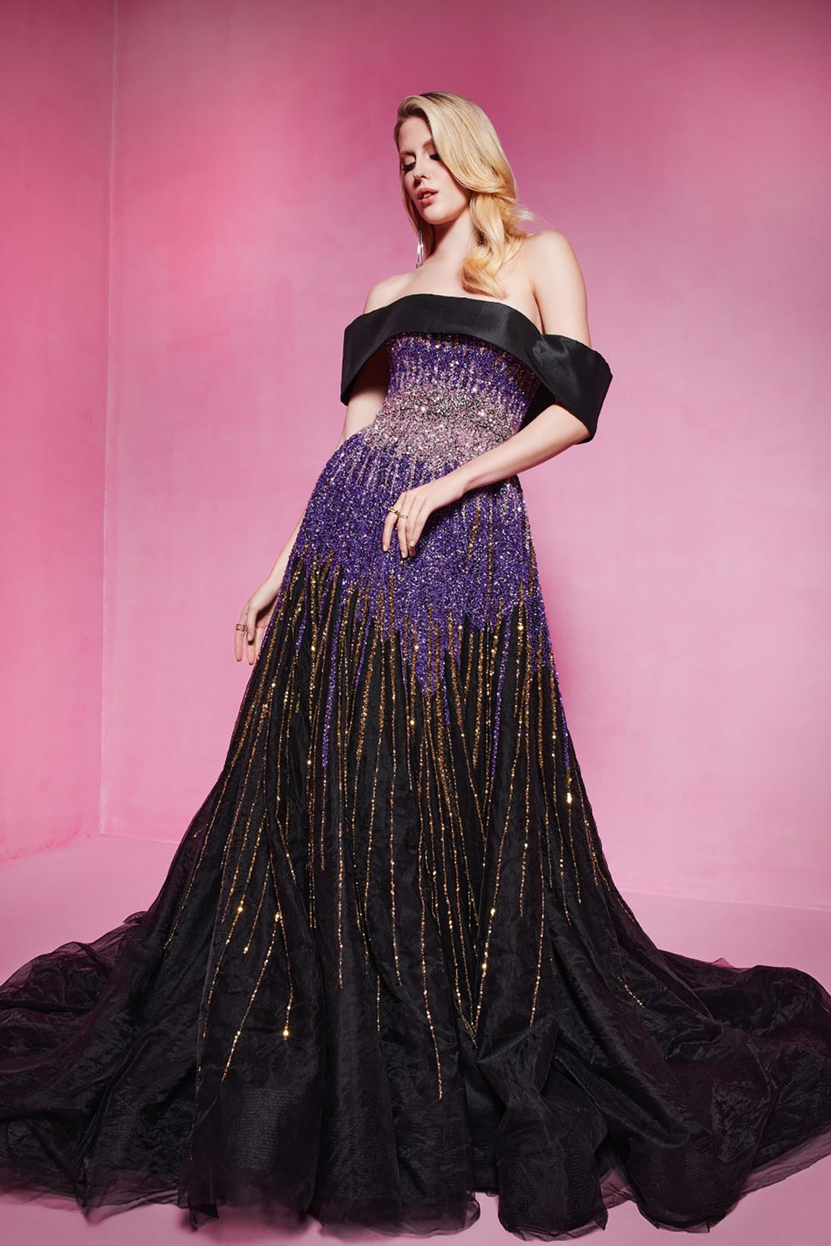 Purple hand-beaded tulle dress. Featuring a strapless upper neckline cut with an A-line flared lower and two off-the-shoulder short sleeves. Complemented with a draped embellishment across the bust.