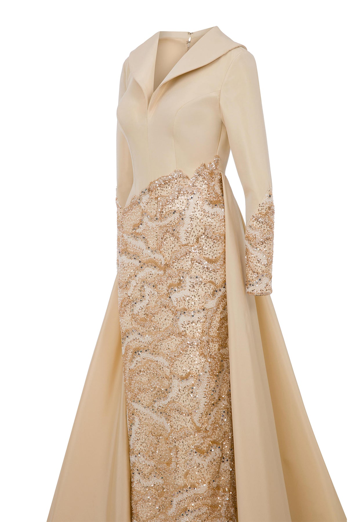 Gold column long dress. Featuring a fitted bodice with a tailored lapel collar and a deep V-neckline, the skirt is a captivating blend of textures and embellishments. Complemented with an upper portion that is adorned with intricate lace embroidery shimmering subtly with sequins. Completed with an embroidered section that extends down to the mid-thigh, where it gradually transitions into a long, flowing, floor-length panel made from a lightweight fabric.