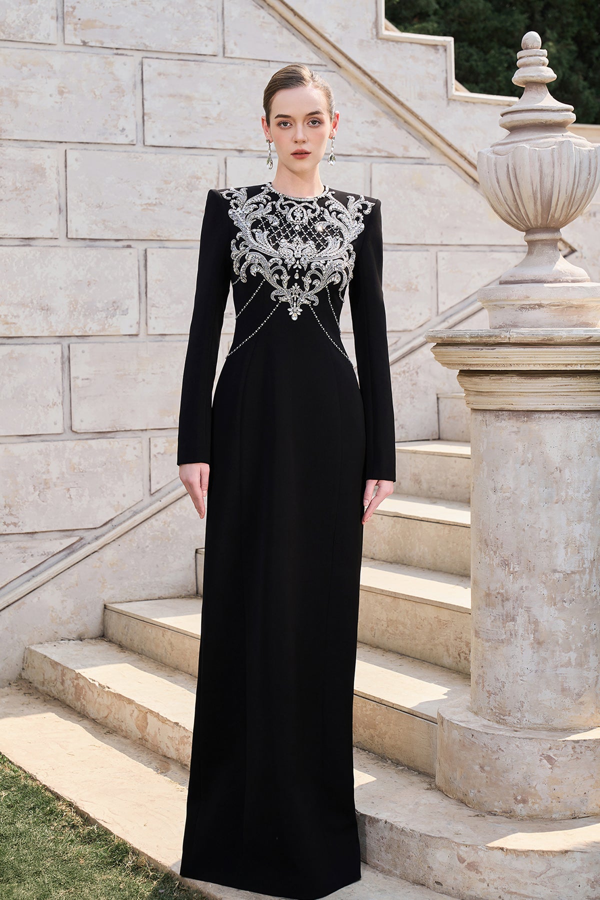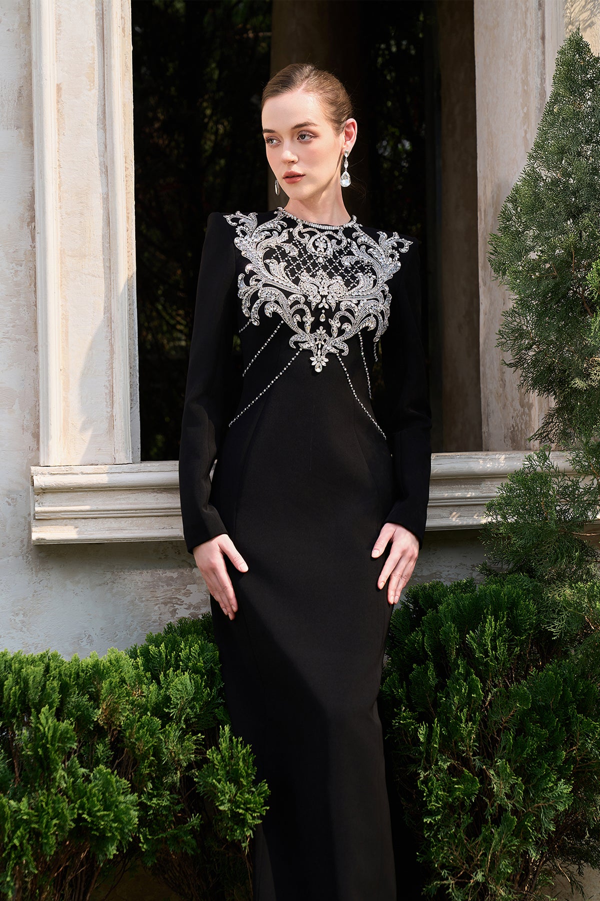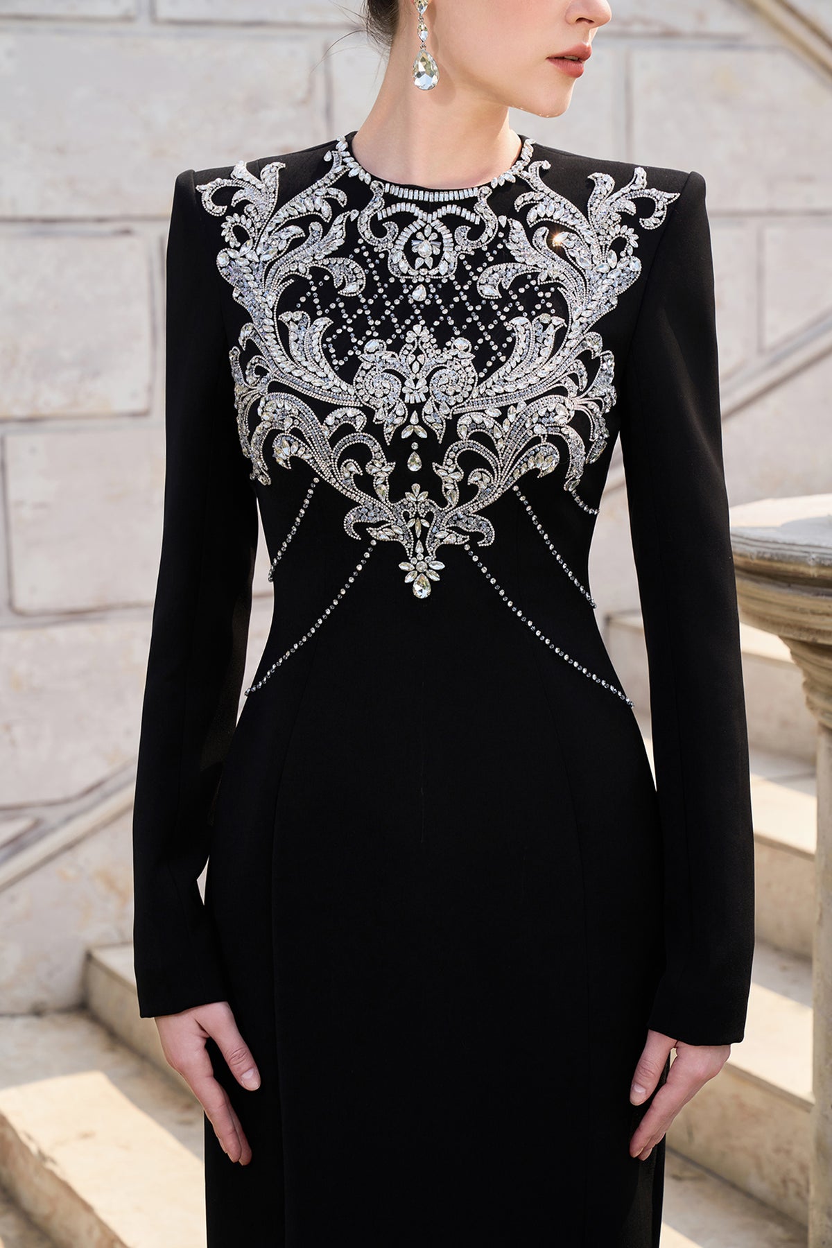 Black satin floor-length dress. Featuring a round neck with long sleeves and padded shoulders that create a structured and powerful silhouette. Complemented with a stunning stylised crystal pattern adorns the chest is adorned, and the silhouette is a sleek, straight skirt. Completed with a concealed back zipper ensures a flawless fit.