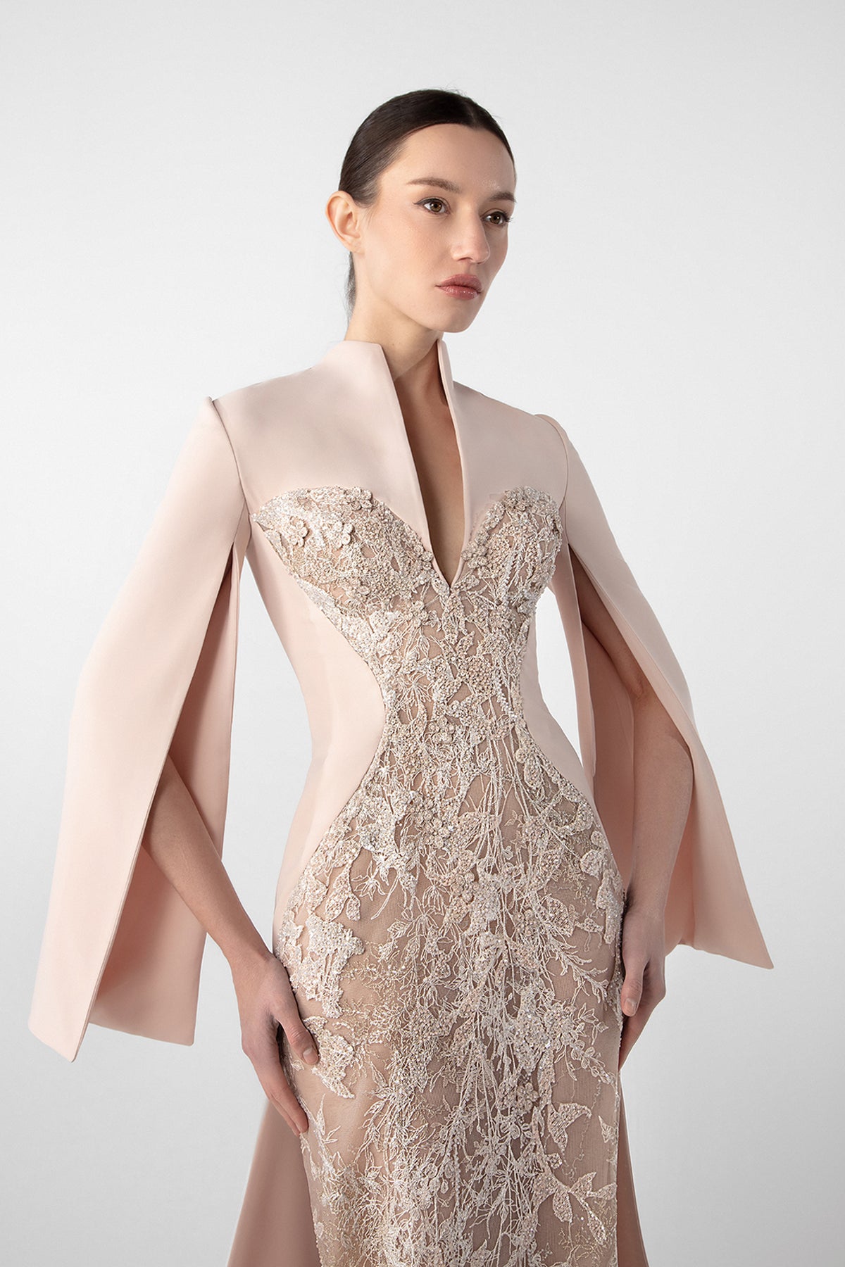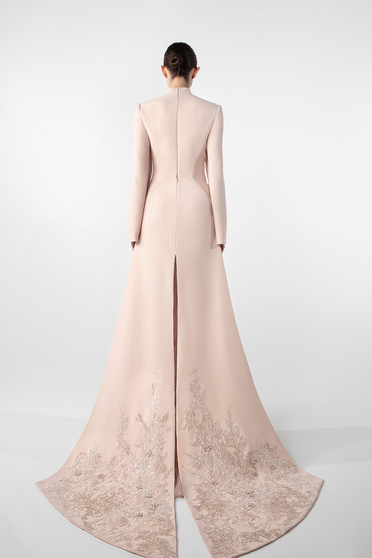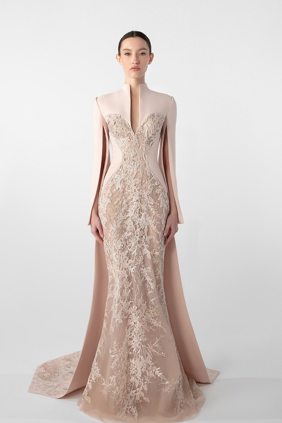 A structured crepe dress with a sculpted high neckline that opens into a deep front slit. The back features a sleek, tailored fit with a flowing embroidered train, while the open sleeves add a dramatic touch.