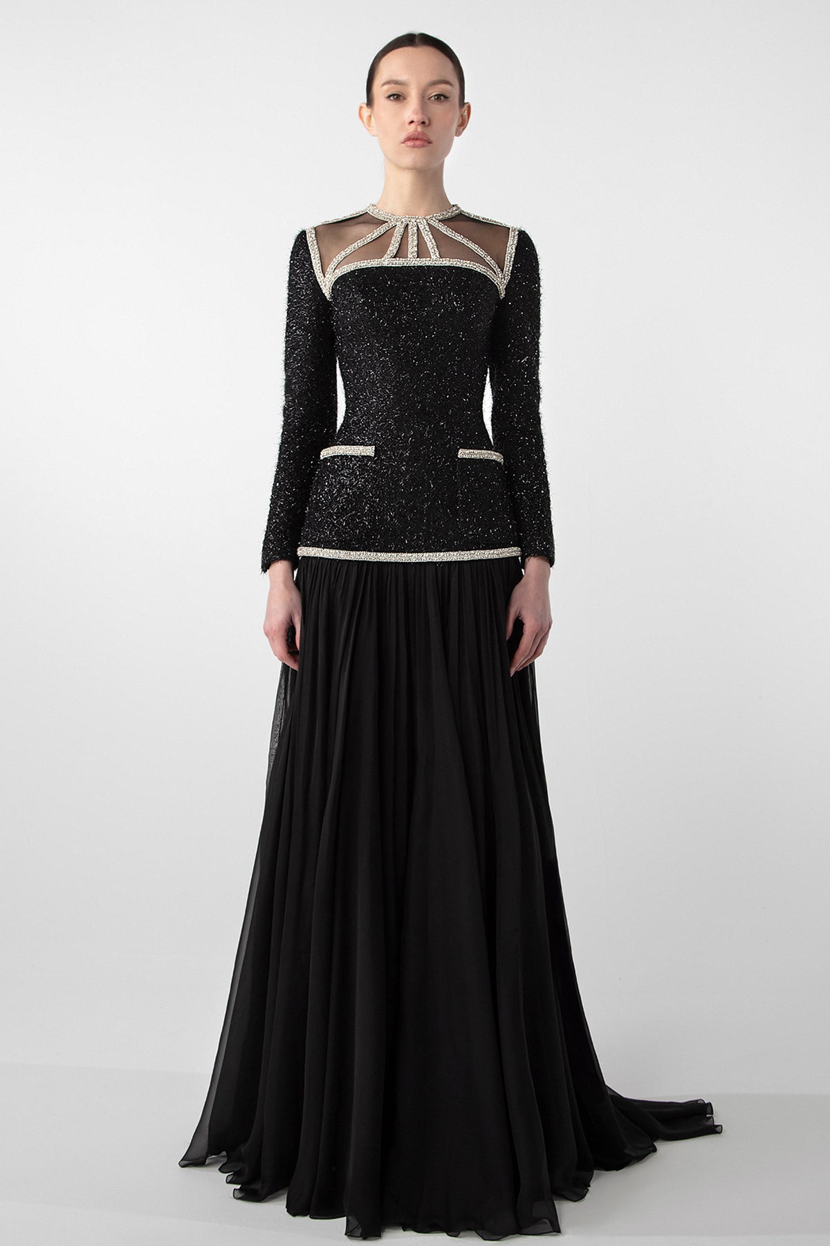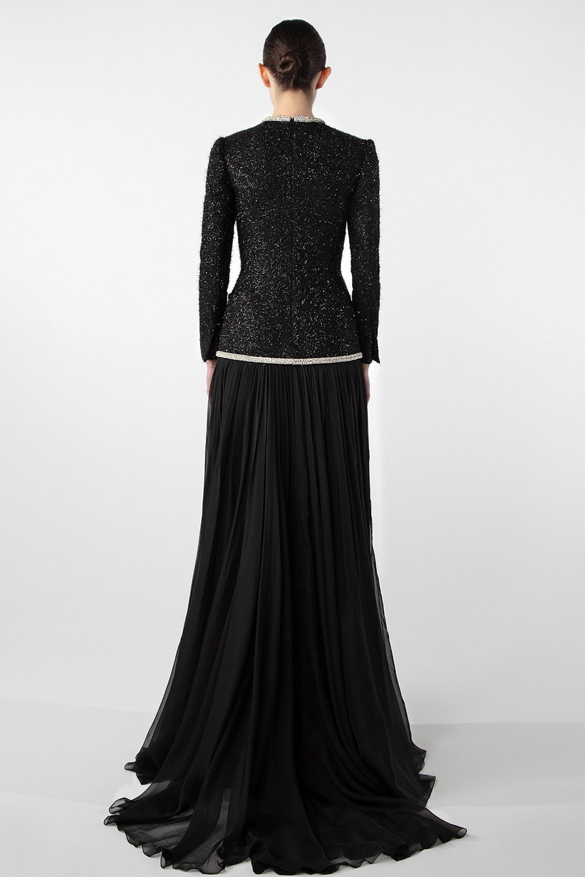 A refined gown featuring a structured tweed bodice adorned with crystal embroidery along the borders. The fitted silhouette extends into a flowing chiffon skirt, adding movement and elegance. A subtle slit enhances the design, making it both sophisticated and modern.