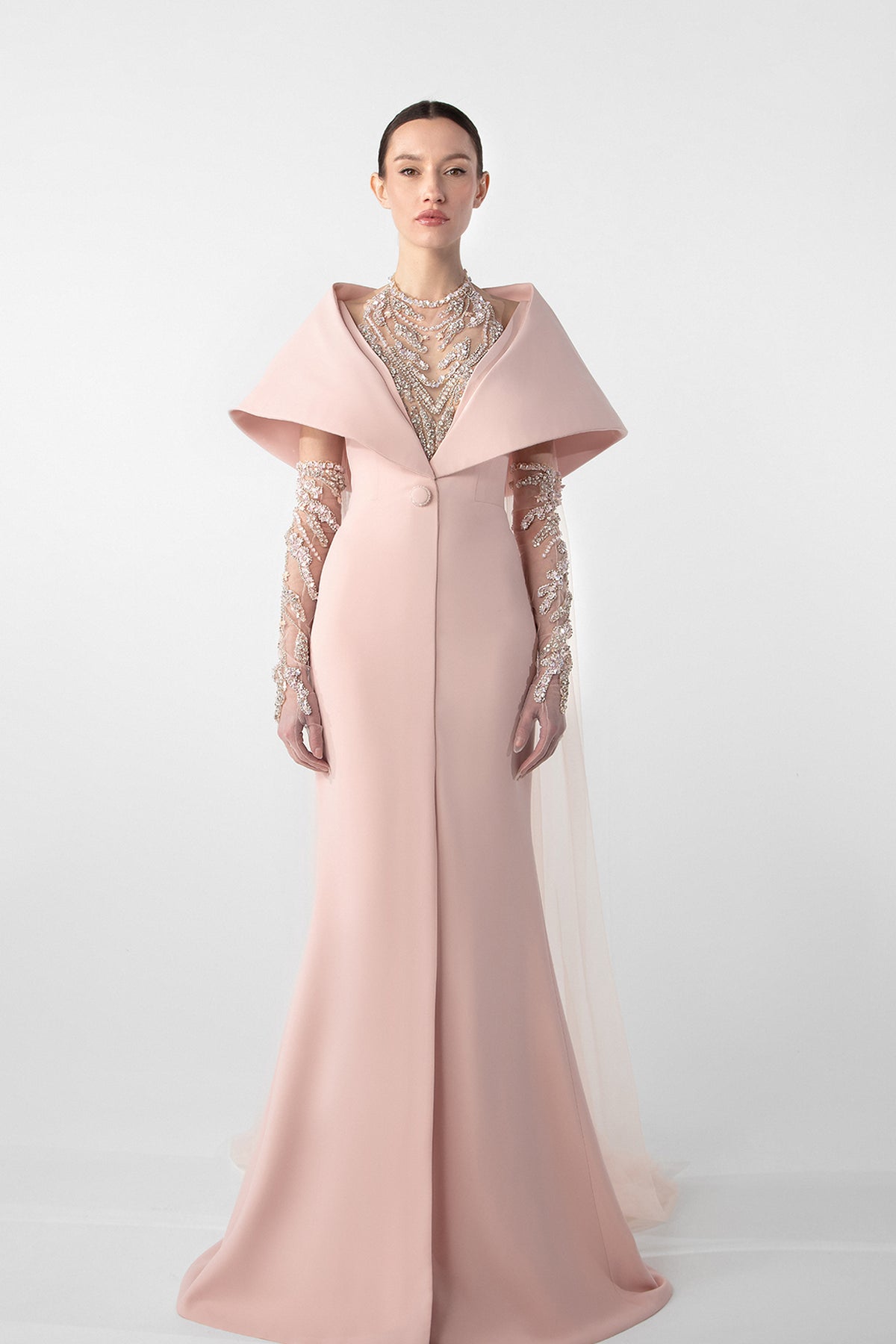 A fitted crepe mermaid dress with a front slit, paired with crystal-embroidered gloves and a sculptural cape that flows into a tulle train.