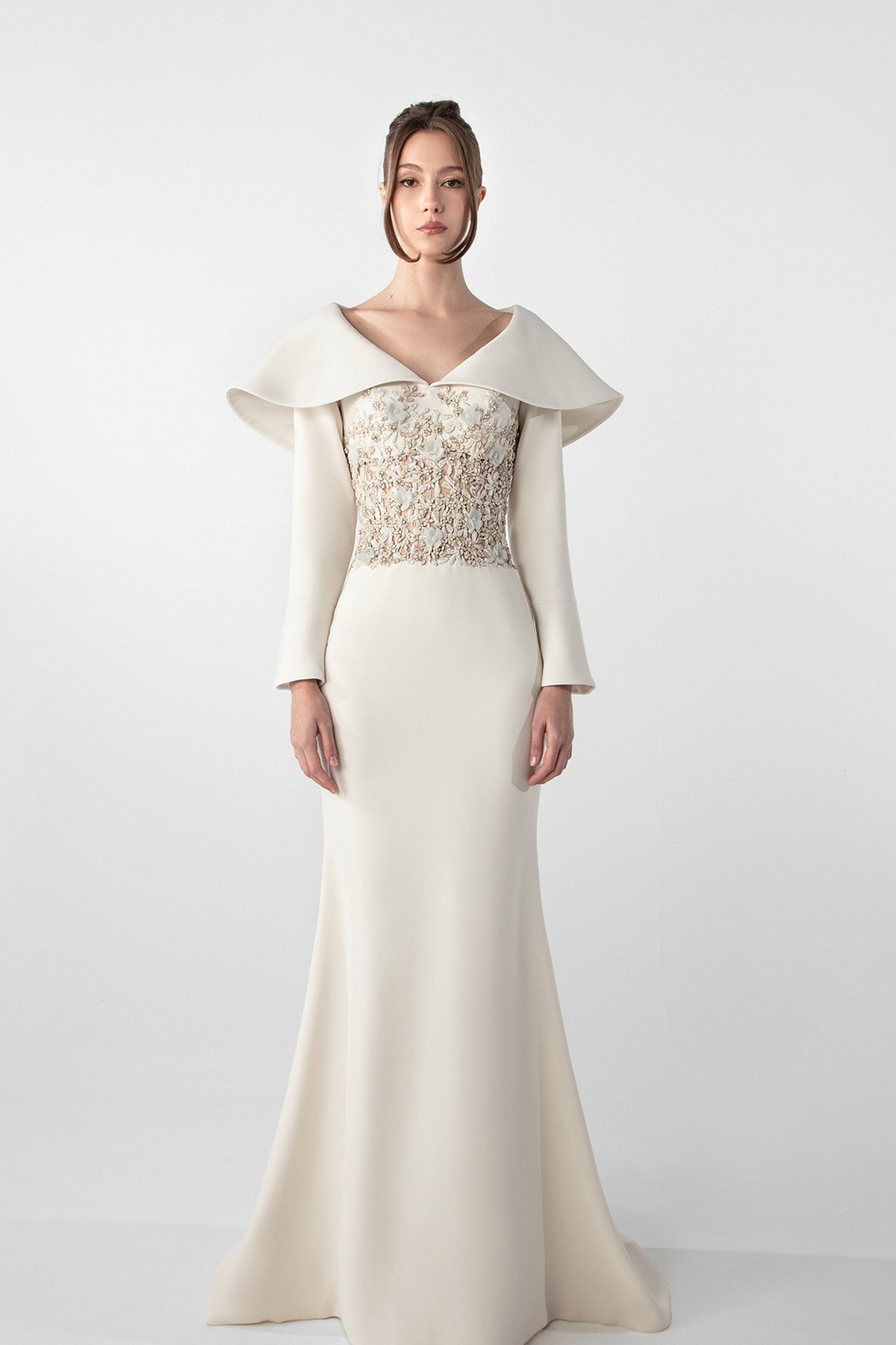 A mermaid dress in ivory crepe fabric with a structured cape collar, long sleeves and a fitted silhouette. The bodice is adorned with hand-applied embroidered stones and crystals.