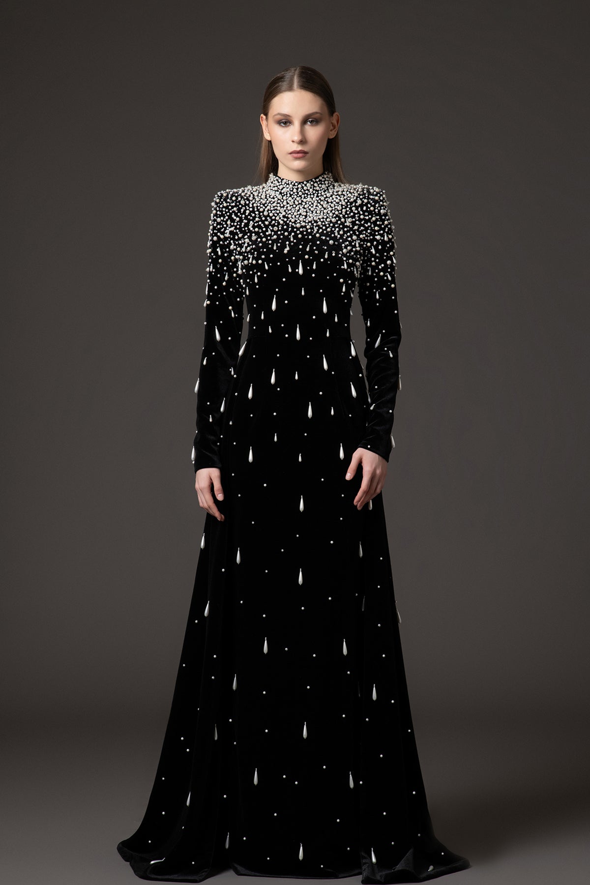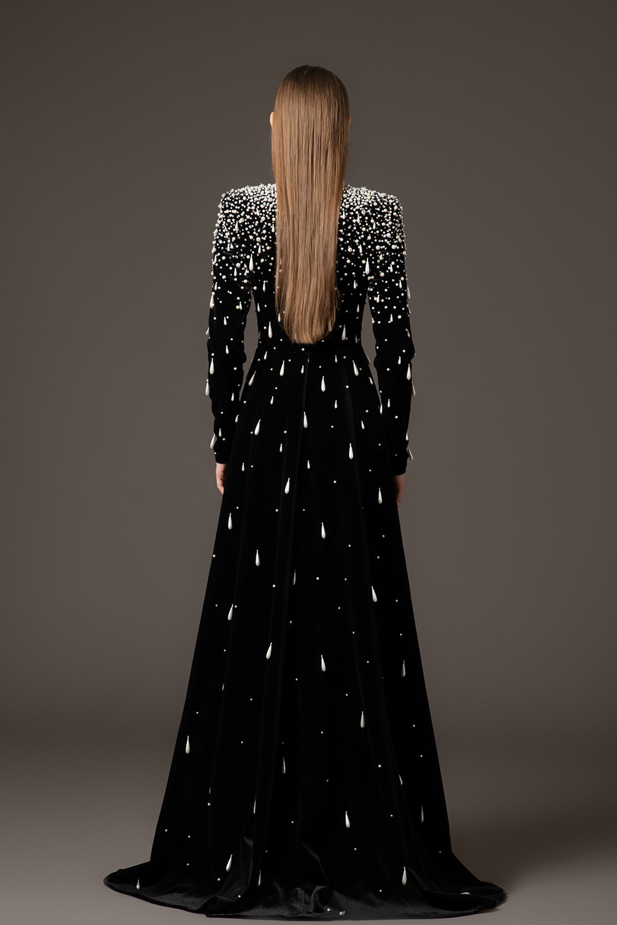 Black velvet A-line long dress. Featuring a closed neckline with fitted long sleeves.