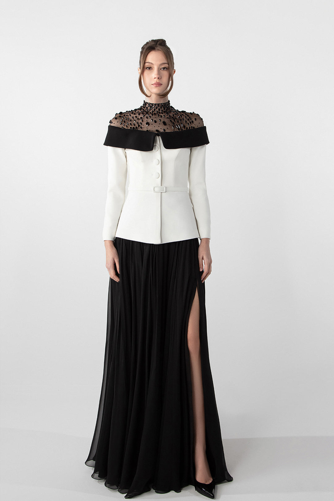 Dress with High Neck, Crystal Embellishments, Long Sleeves, Side Draping and Cape