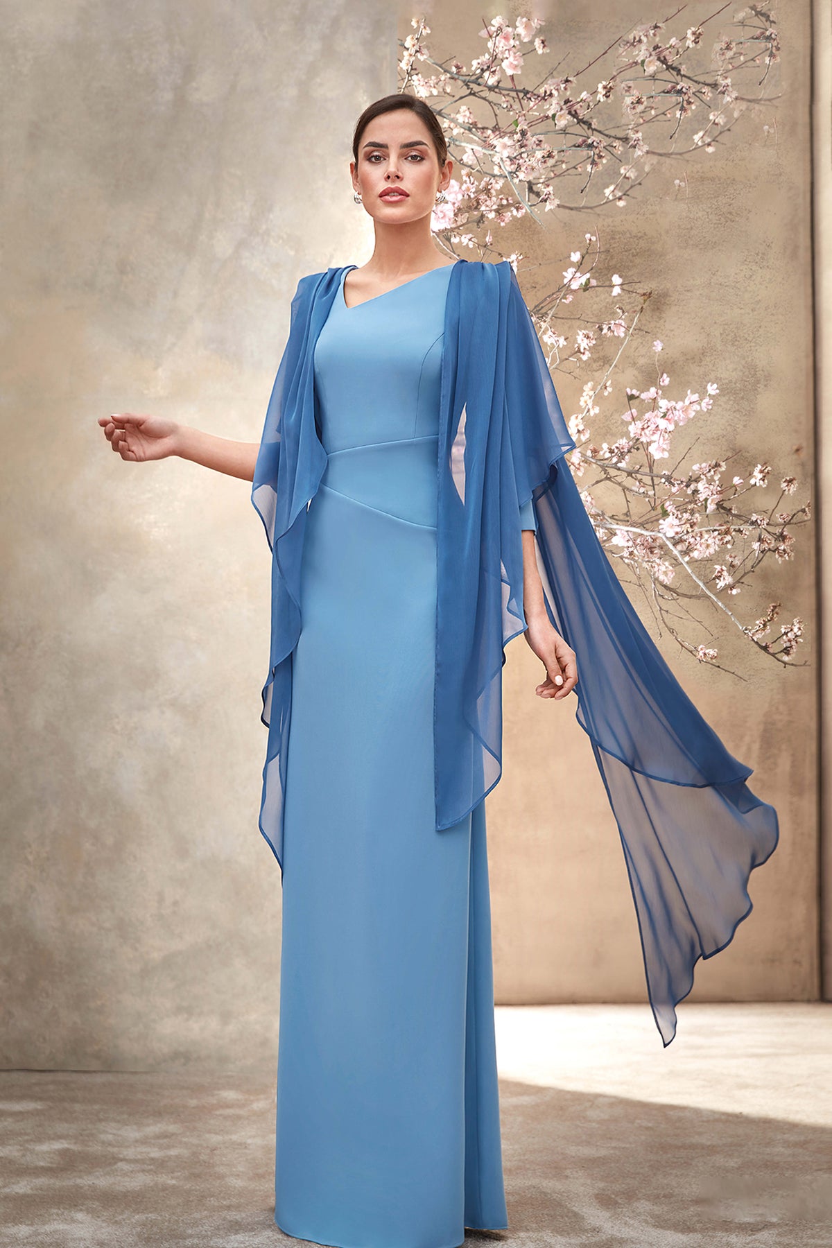 Light blue crepe dress. Featuring with an asymmetrical front neckline and chiffon bands adorning the shoulders. Complemented with waist is accentuated with cutouts.