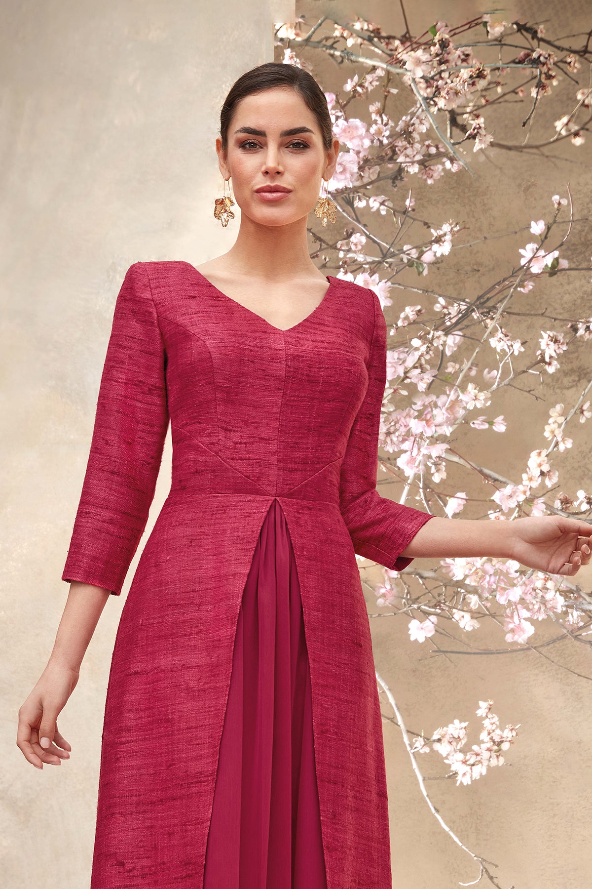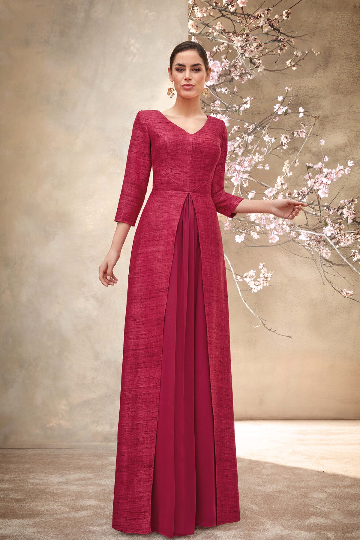 Red a-line long dress. Featuring a combination of rustic silk and chiffon fabrics with V-neckline and front slit in the skirt that reveals the matching chiffon underneath.