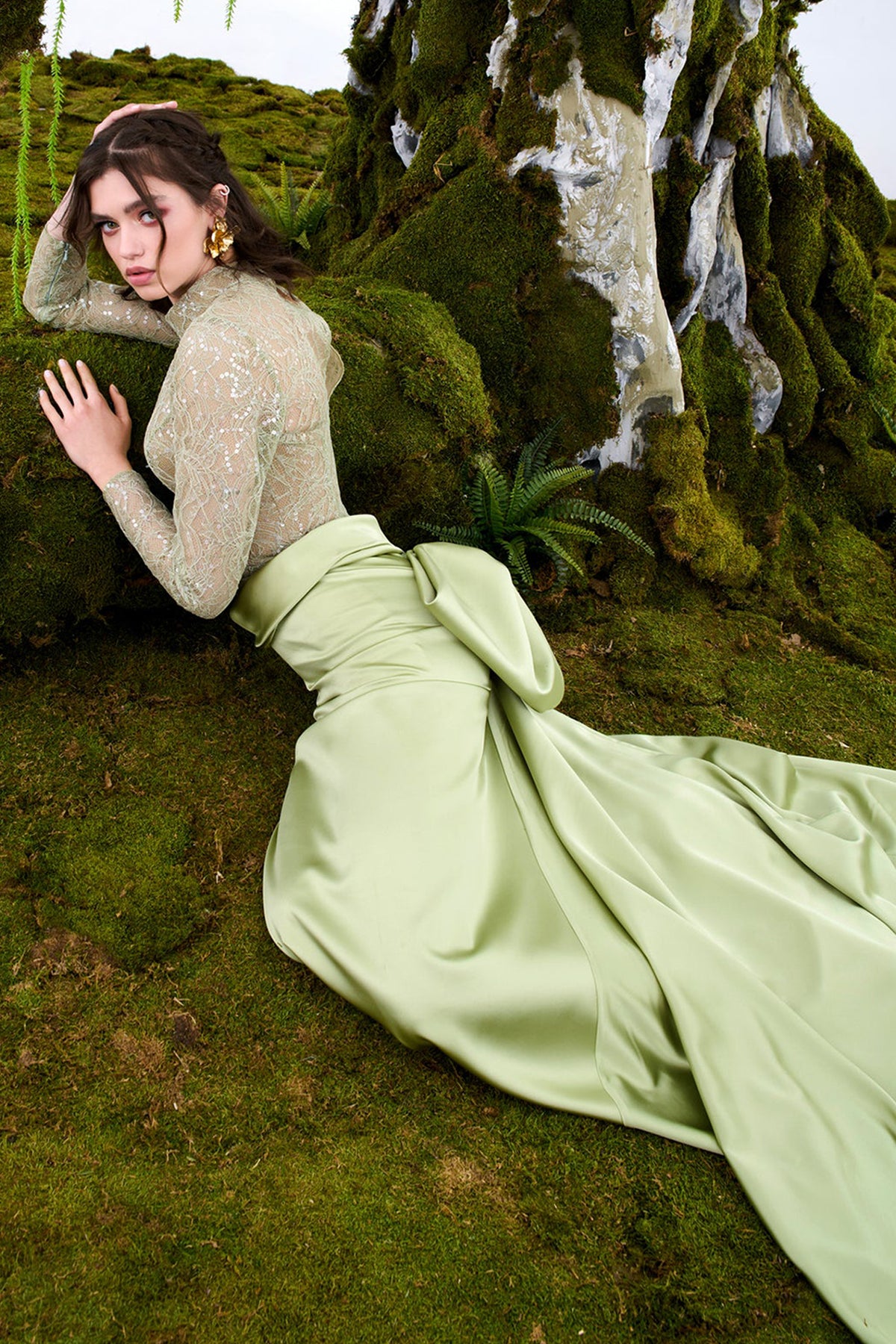 Light green column long dress. Featuring long sleeves and a fitted sheer-sleeved top with a high-fashion skirt and a form-fitting bodice that skims the torso. Complemented with a high-neckline and floor-length train that trails behind the model.