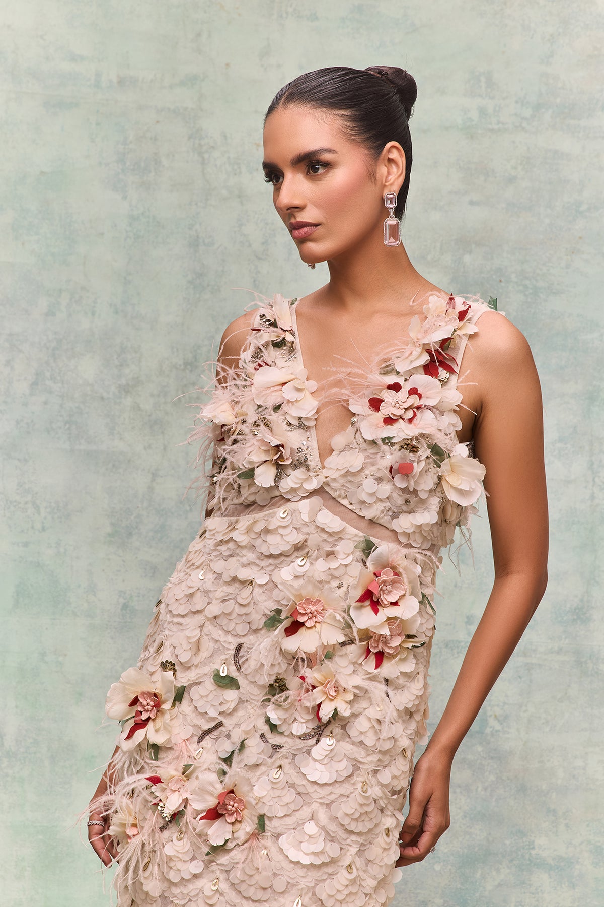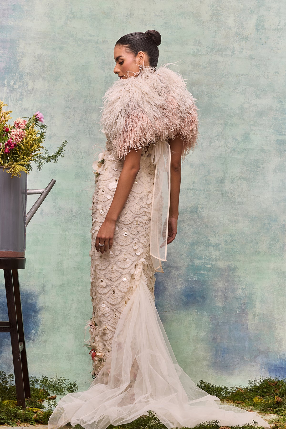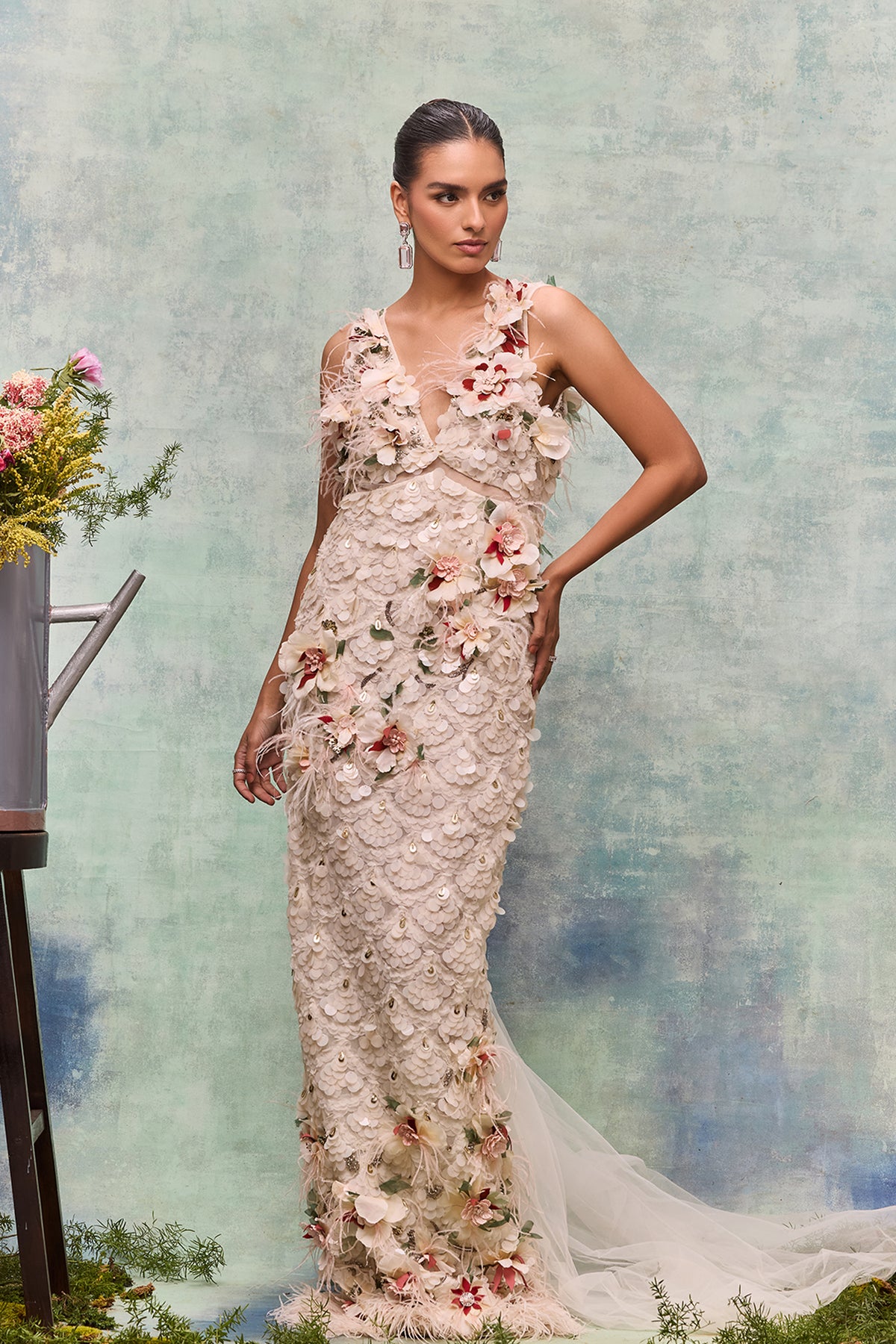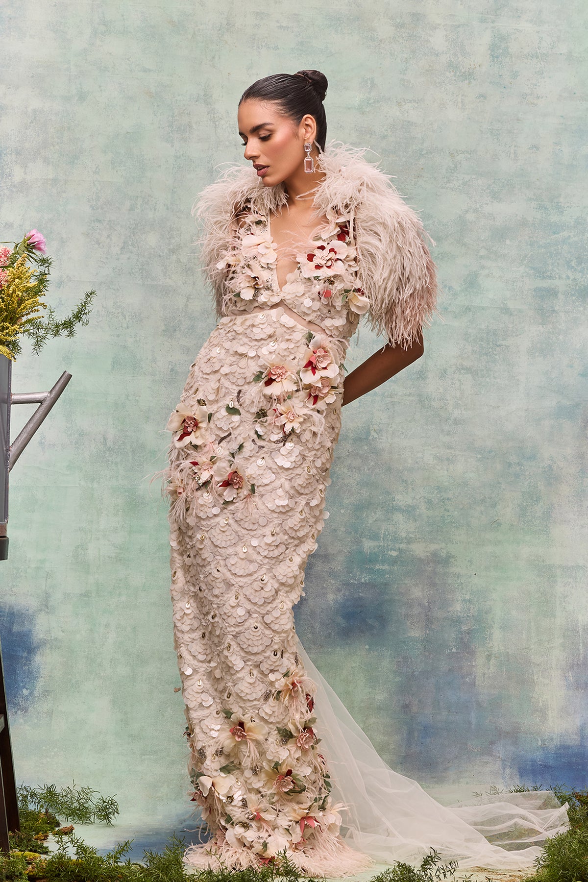 Blush tulle Silk Flared Pants. Featuring a polished contemporary silhouette with a cropped jacket with a classic collar and lapels and pearl bead abstract embroidery. Complemented with a refined and versatile piece. Completed with a bold statement that flared shape by the same pearl and bead embroidery in an abstract motif.