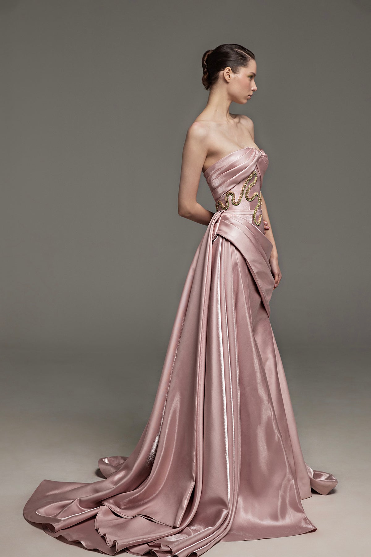 Pink lurex mikado dress. Featuring a built-in corset, draped chest, and a side draped detail on the waist. Complemented with a side back train and linear pattern of Swarovski embroidery.