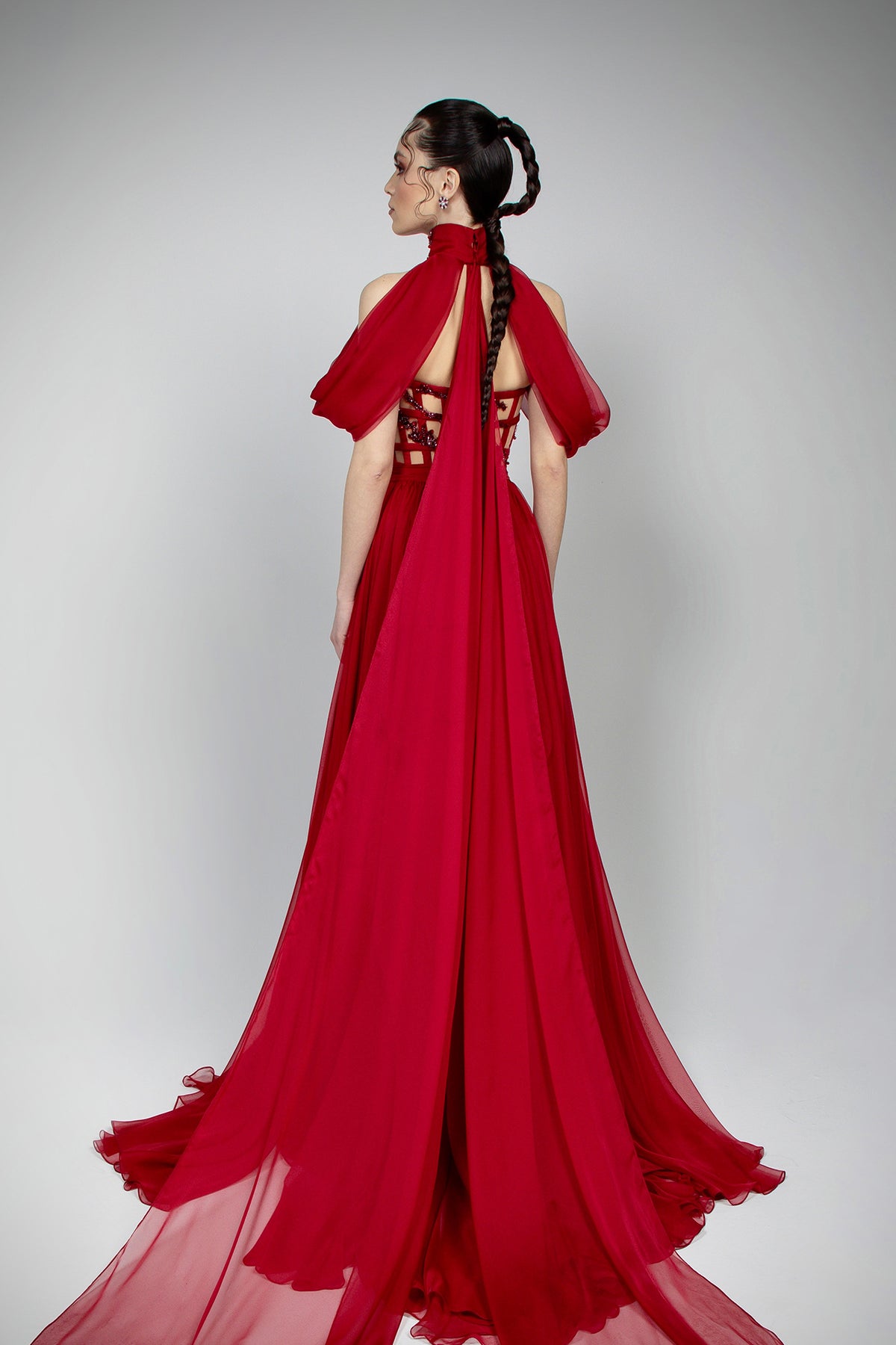 Red silk mousseline dress. Featuring a built-in corset in a cage effect, the dress has a detachable train with a high neck and two flowy draped shoulders. Complemented with a hand-embroidered corset and cape, topped with Swarovski crystals.