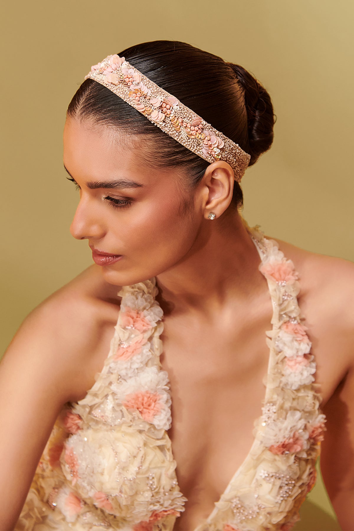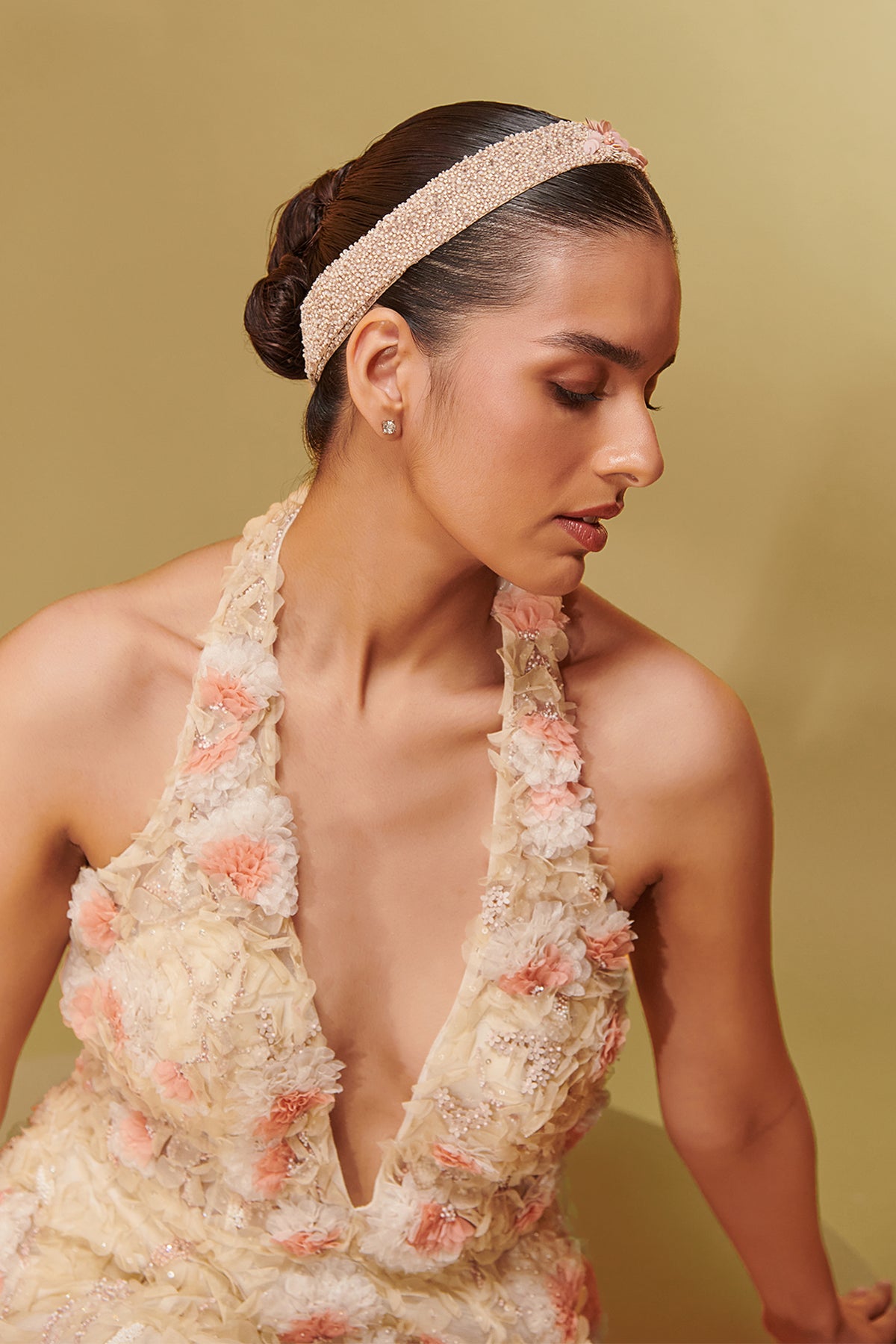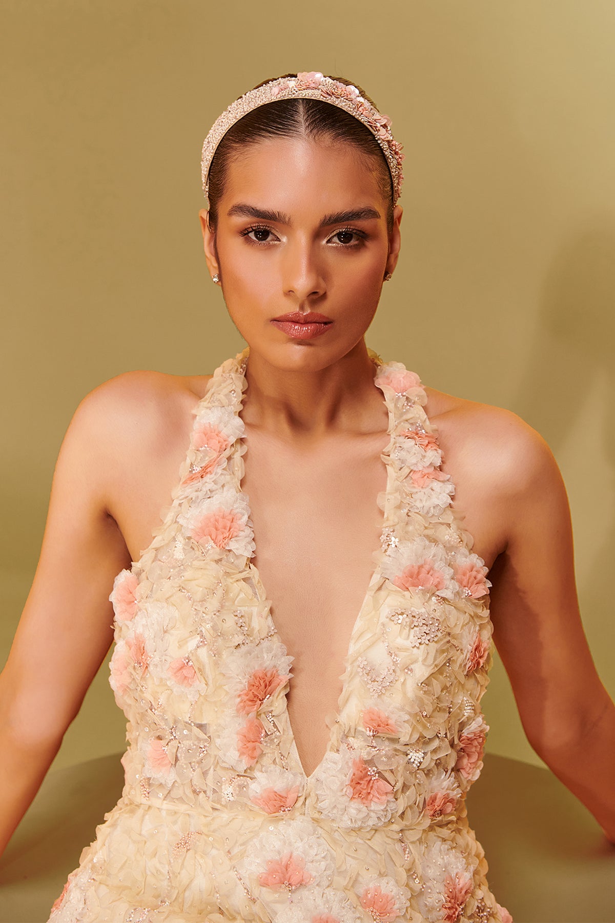 Ivory mesh and crepe midi dress. Featuring that show-stopping piece, a chic halter neck, and playful laser-cut embroidery.