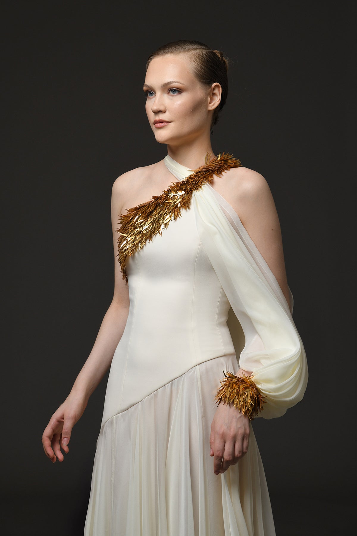 Ivory crêpe long dress. Featuring chiffon gold Embroidery asymmetric shoulder, and back zipper.